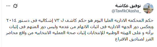 وقال توفيق عكاشة عما كشفه حكم المحكمة الإدارية العليا بشأن طعون انتخابات مجلس النواب: "حكم المحكمة الإدارية العليا... هو حكم كاشف لـ ٧٣ إشكالية فى دستور ٢٠١٤، ويعكس دور الجهة الإدارية فى إثبات الاتهام من عدمه، وليس دور المتهم فى إثبات براءته".