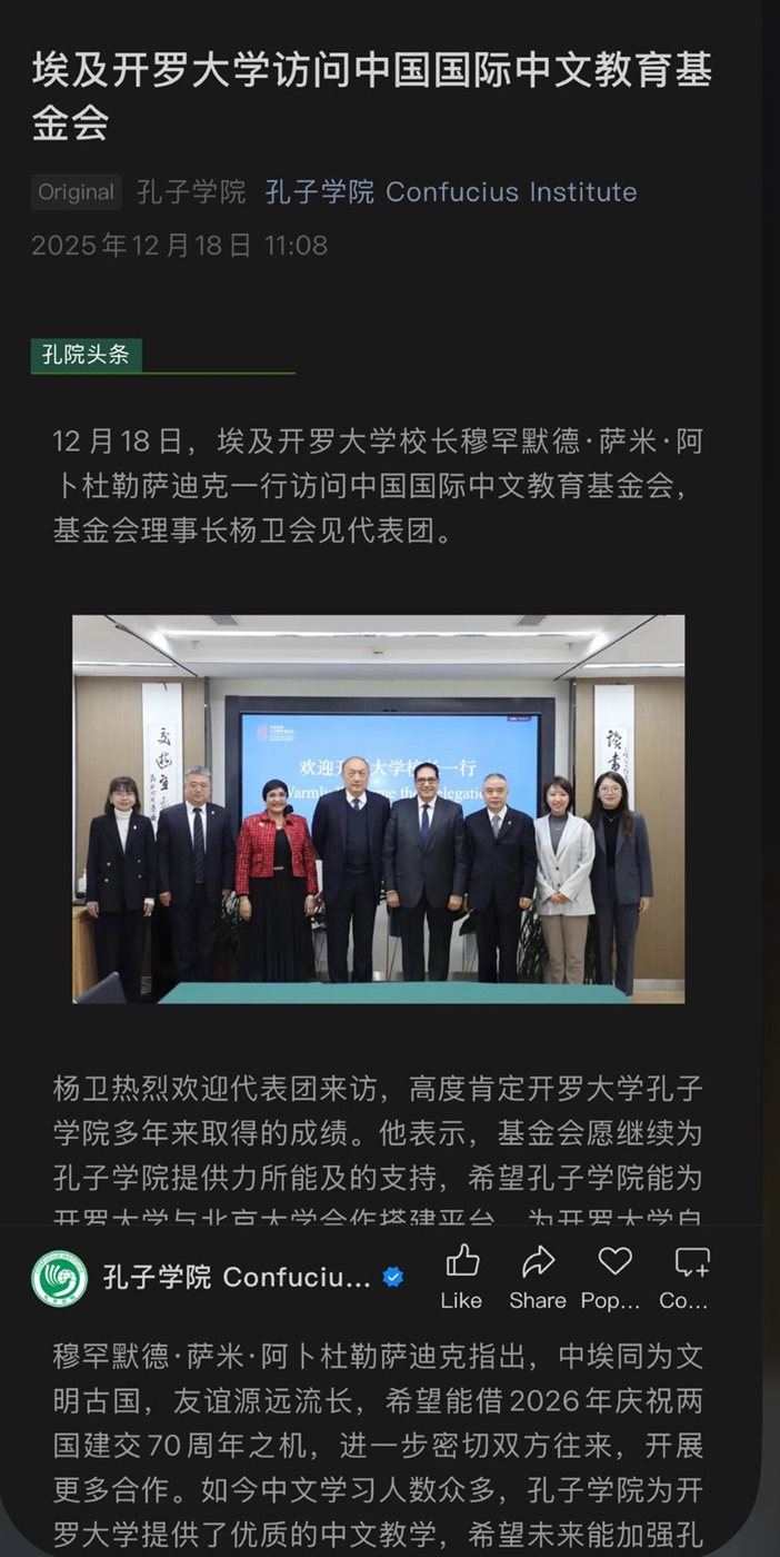 كما تناولت التغطيات الإعلامية، لقاءات الدكتور محمد سامى عبد الصادق رئيس جامعة القاهرة مع قيادات جامعة بكين، والمؤسسة الصينية للتعليم الدولي للغة الصينية، ومركز التبادل الدولي للتعليم اللغوي، كما أثنى الجانب الصيني على الدور الريادي الذي تقوم به جامعة القاهرة ومعهد كونفوشيوس في نشر وتعليم اللغة والثقافة الصينية.