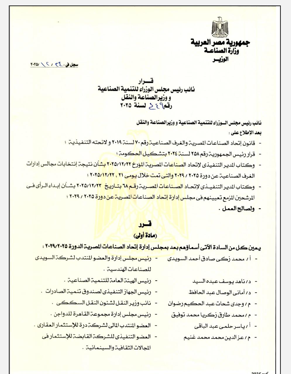 أصدر الفريق المهندس كامل الوزير، نائب رئيس مجلس الوزراء للتنمية الصناعية وزير الصناعة والنقل؛ القرار الوزاري رقم 449 لسنة 2025 بتعيين 6 أعضاء بمجلس إدارة اتحاد الصناعات المصرية وفقًا للقانون رقم 70 لسنة 2019 المنظم لأنشطة اتحاد الصناعات ولائحته التنفيذية.