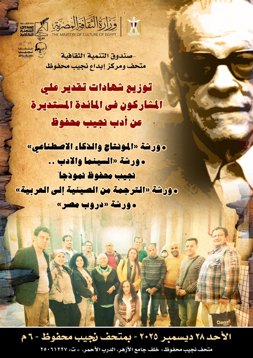 توزيع شهادات الورش المتخصصة في الفنون والآداب بمتحف نجيب محفوظ الأحد المقبل