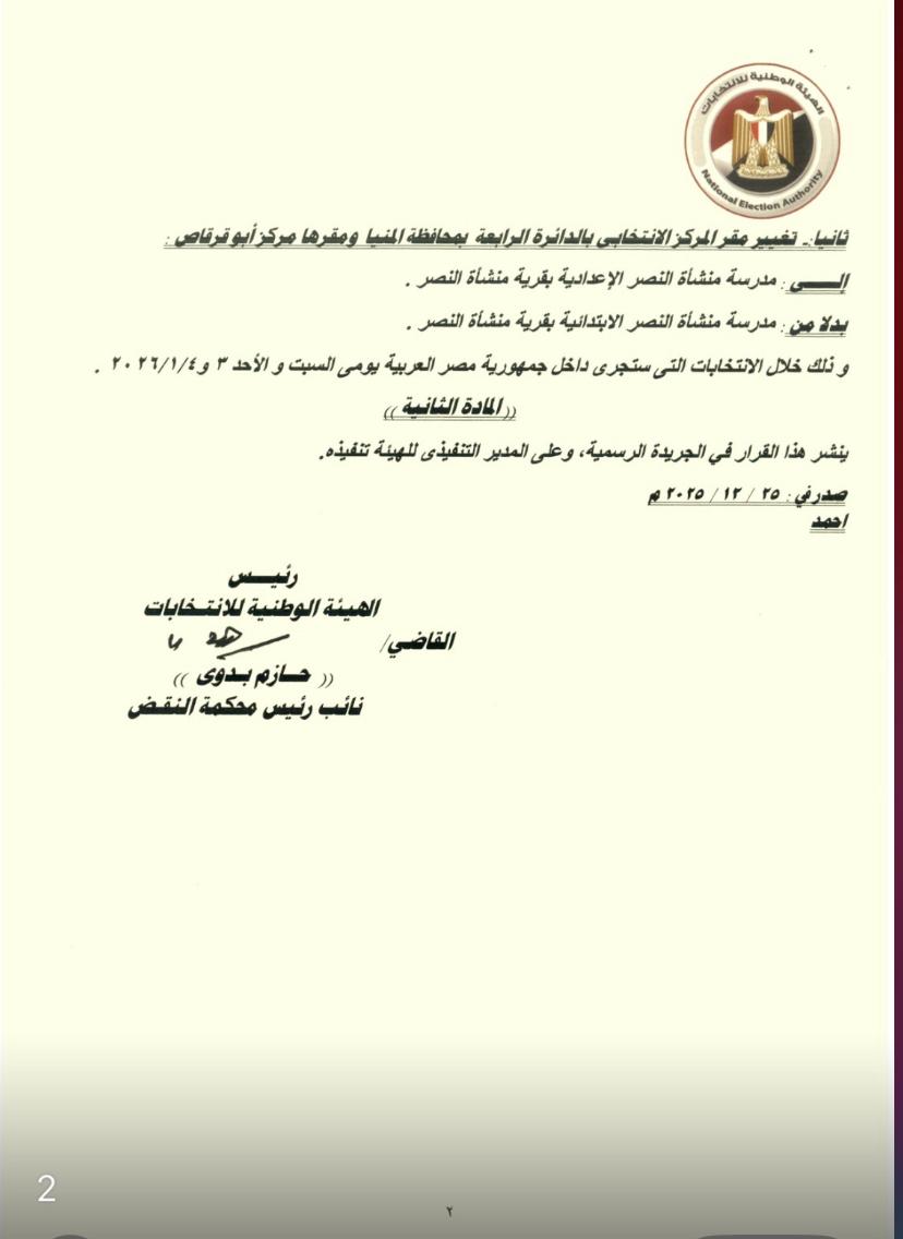 أصدرت الهيئة الوطنية للانتخابات القرار رقم (٨٠) لسنة ٢٠٢٥، بشأن تغيير مقري مركزين انتخابيين بمحافظتي الإسكندرية والمنيا، وذلك في إطار الاستعدادات الجارية لانتخابات مجلس النواب.