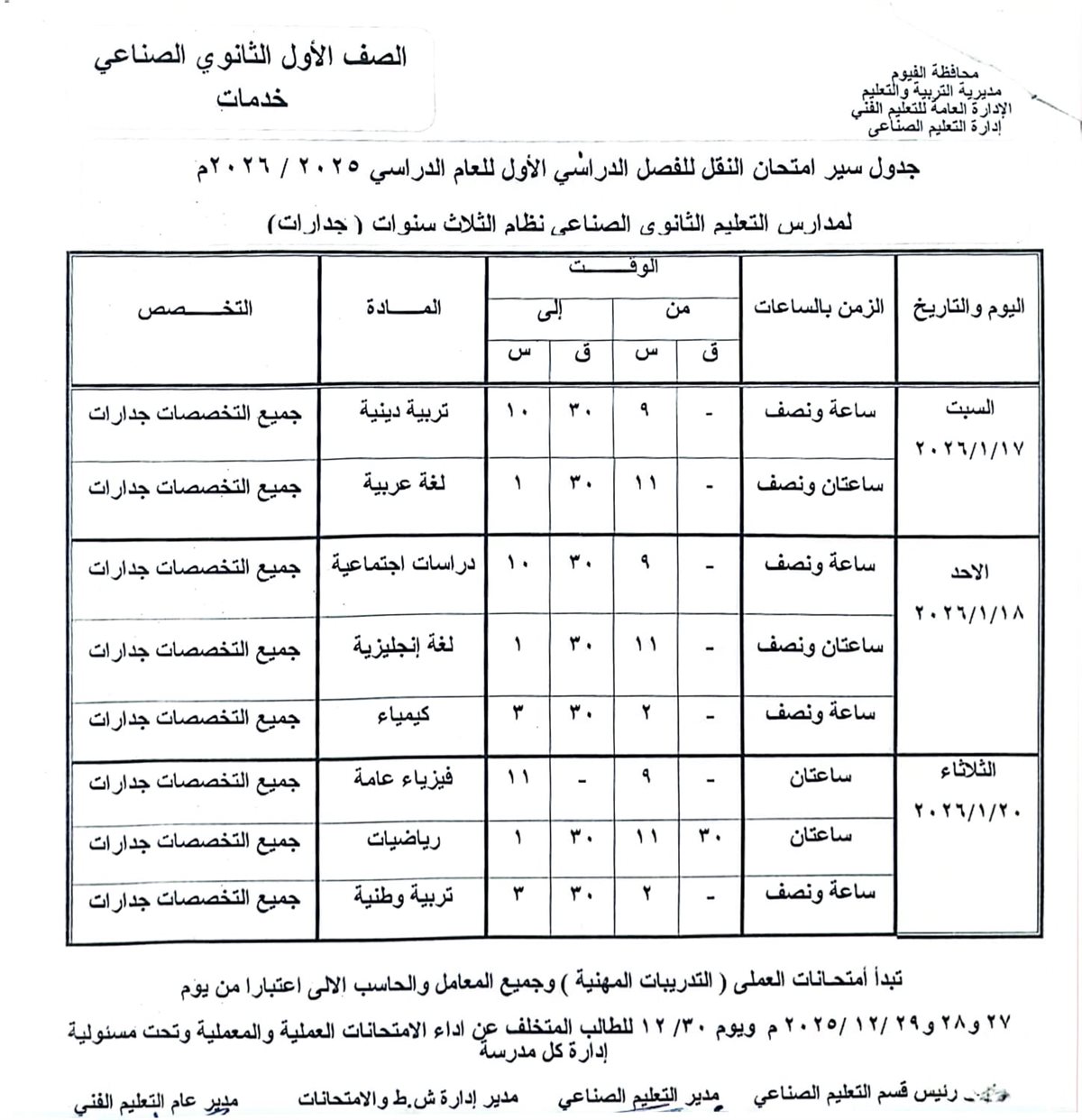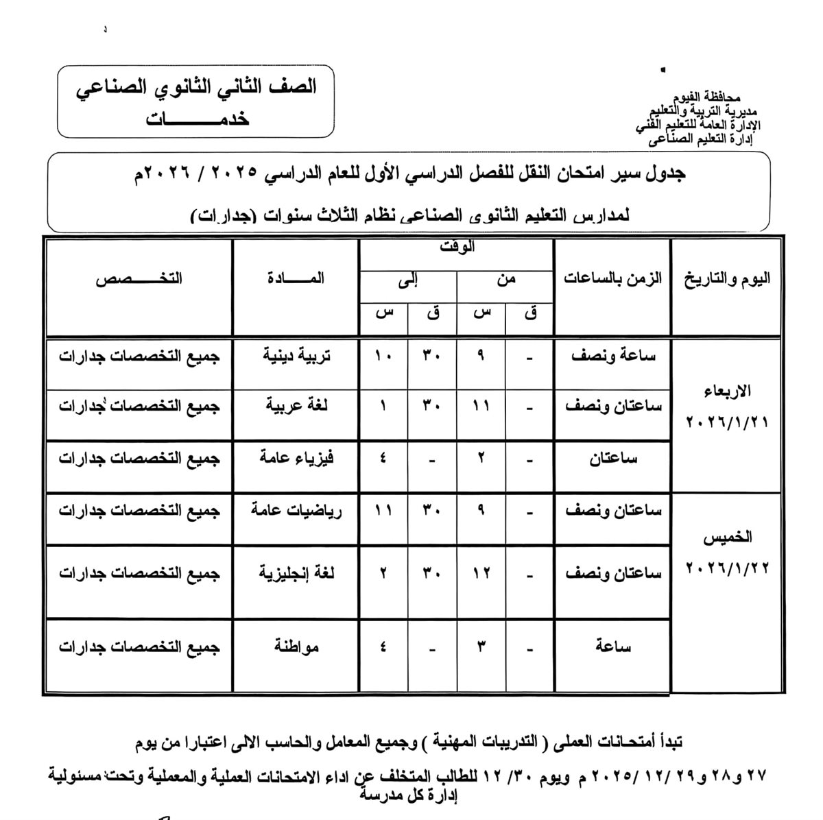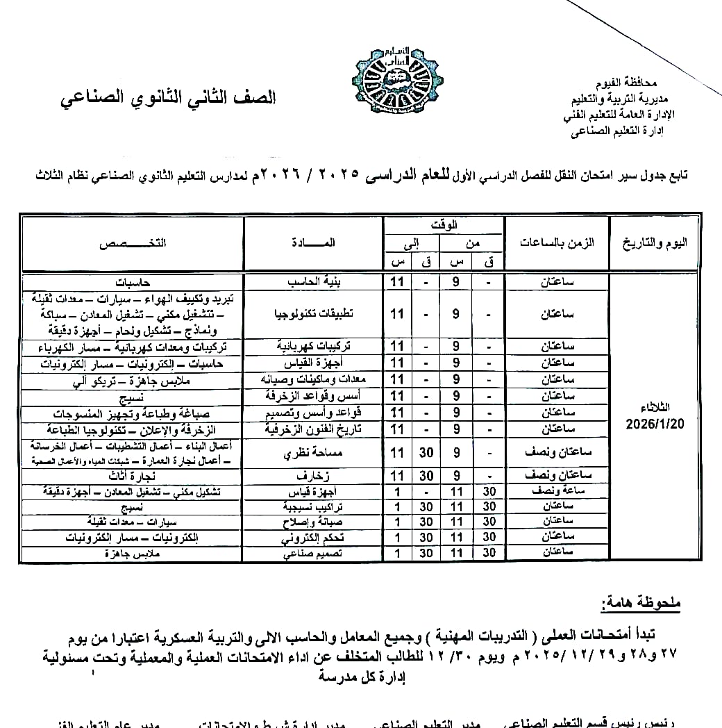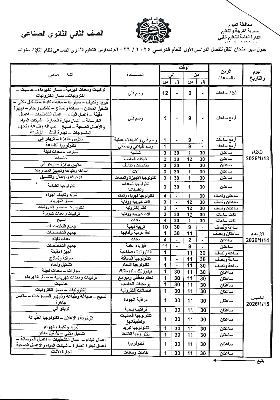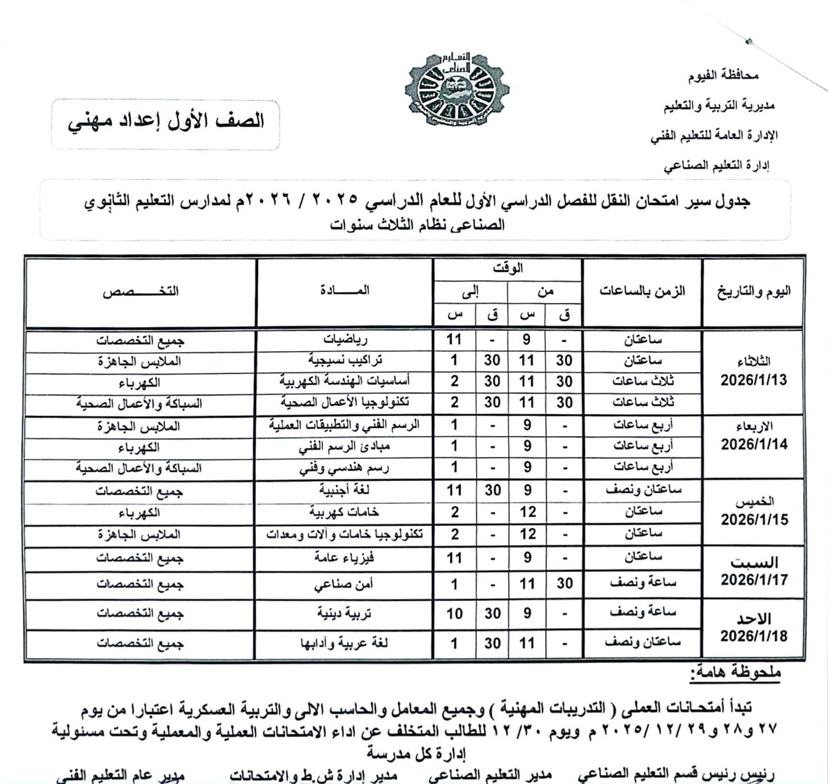محافظ الفيوم يعتمد جدول امتحانات النقل لمدارس التعليم الفني