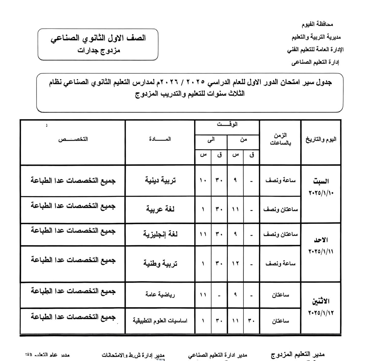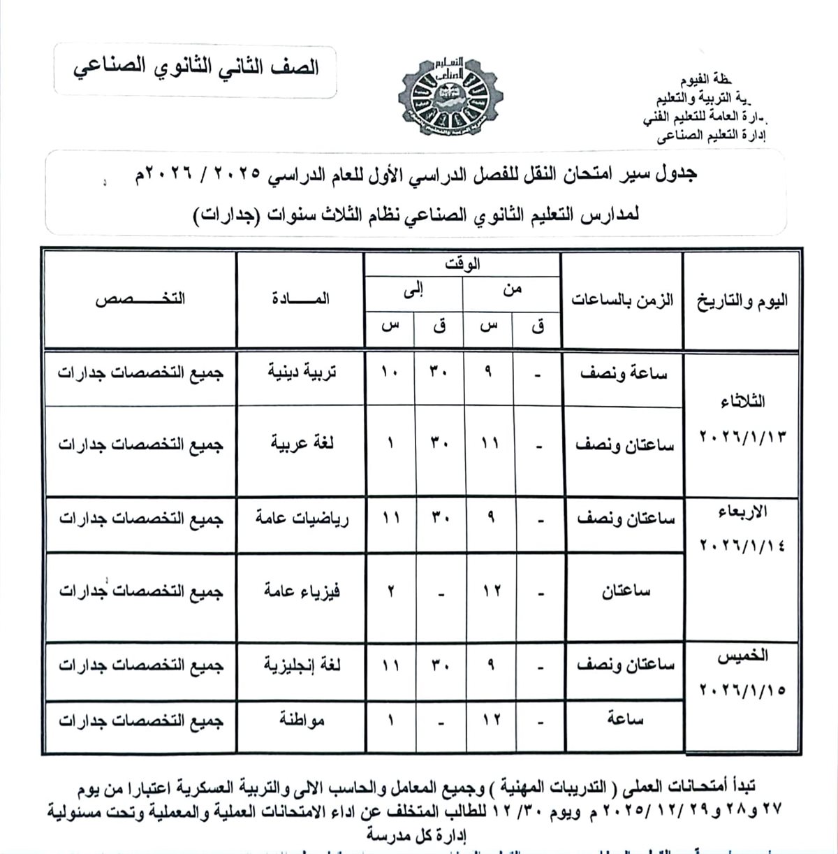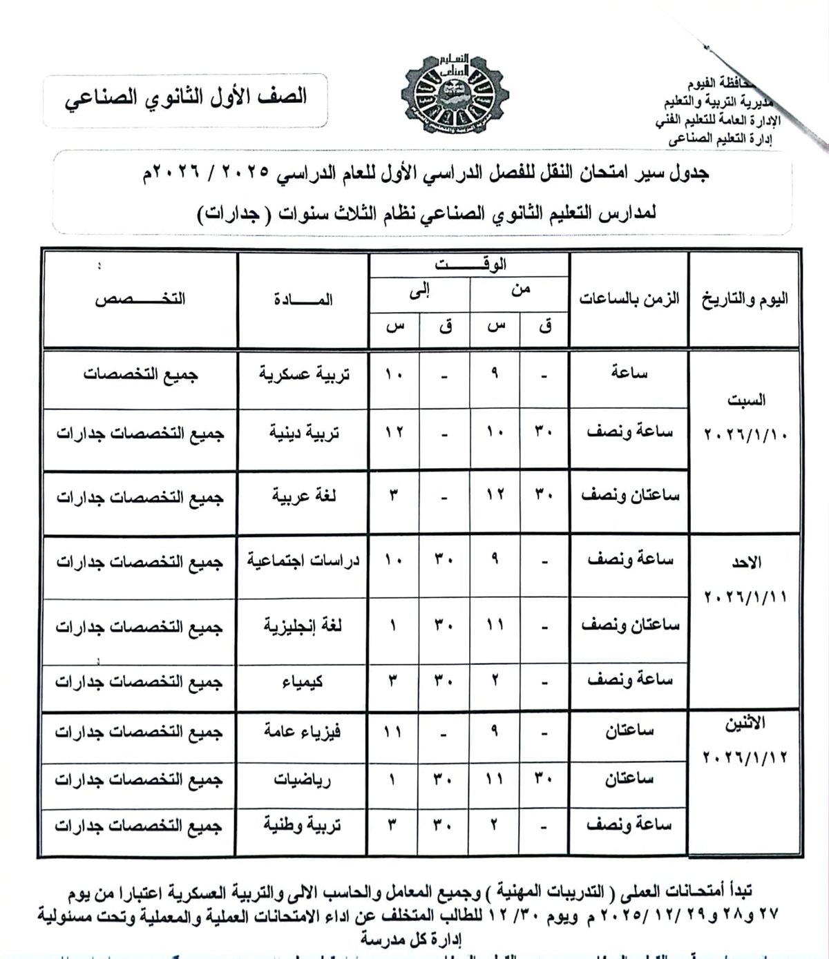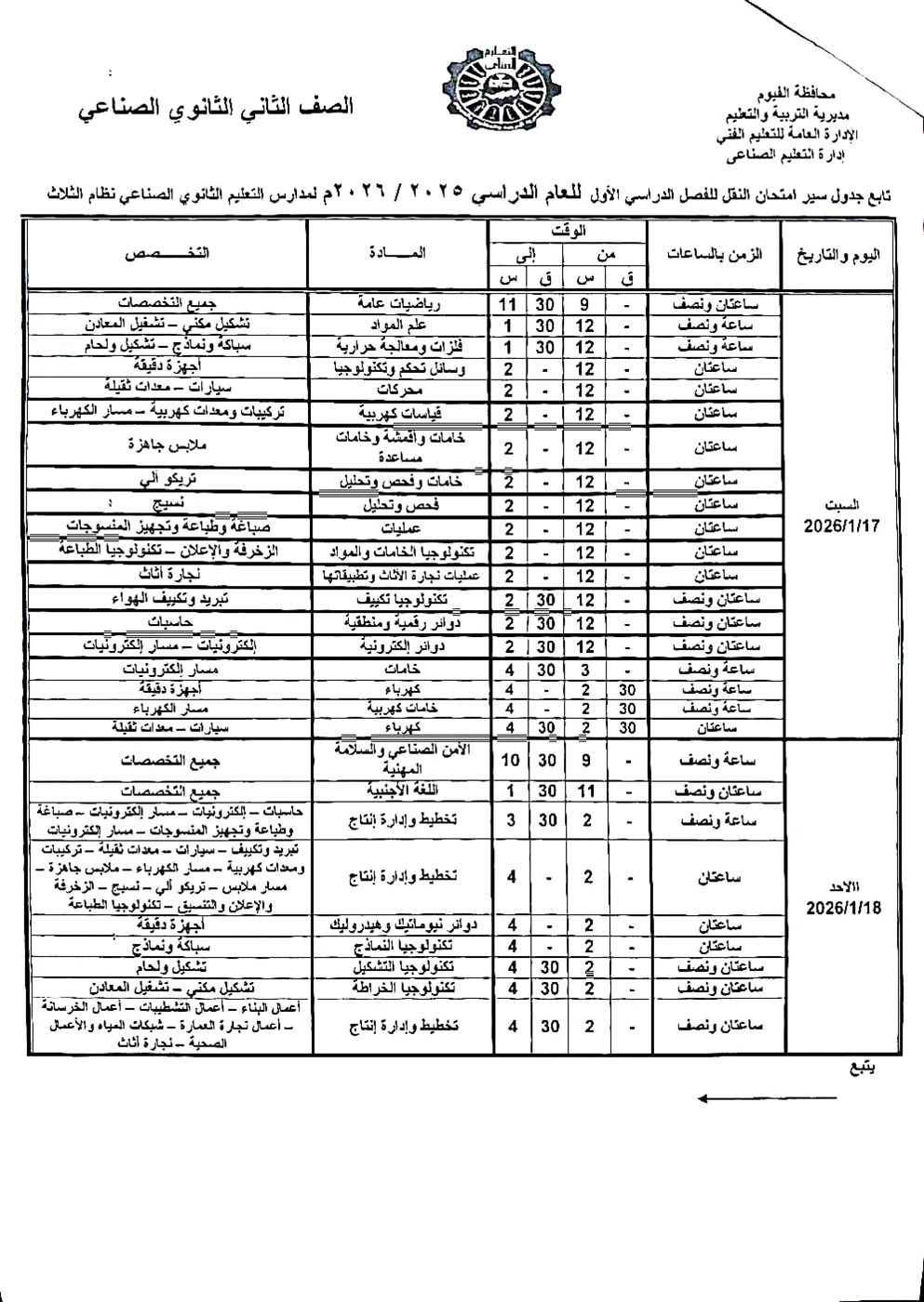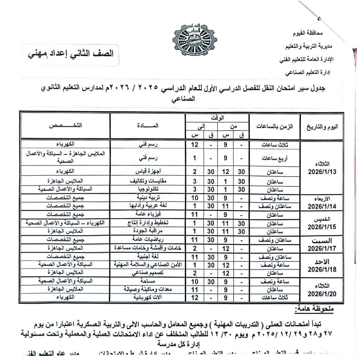 اعتمد الدكتور احمد الانصاري محافظ الفيوم، جداول امتحانات الفصل الدراسي الأول لمدارس التعليم الفني بنوعياته ( تجاري – فندقي ـ زراعي – صناعي – مزدوج )، وتبدأ امتحانات المواد النظرية اعتبارا من يوم 3 يناير المقبل وتنتهي تباعا بحسب نوعية التعليم والبرنامج التعليمي " تجاري 3 سنوات – تجاري 5 سنوات – جدران – مزدوج" و" زراعي – زراعي مهني – زراعي مزدوج - زراعي جدارات "، و"صناعي 3 سنوات، صناعي 5 سنوات – صناعي مهني – صناعي مزدوج ـ صناعي جدارات".