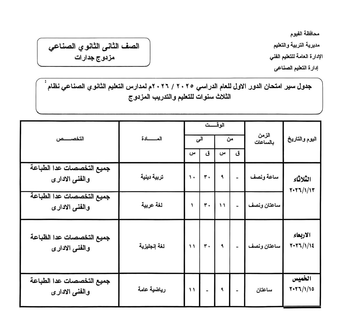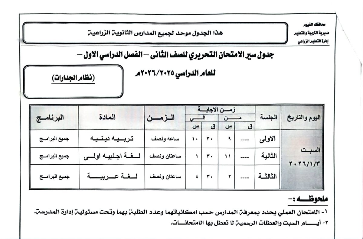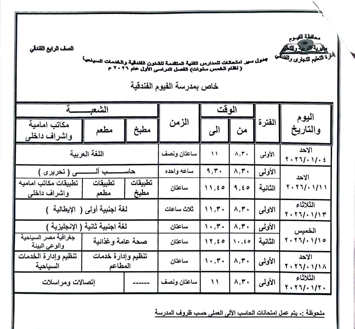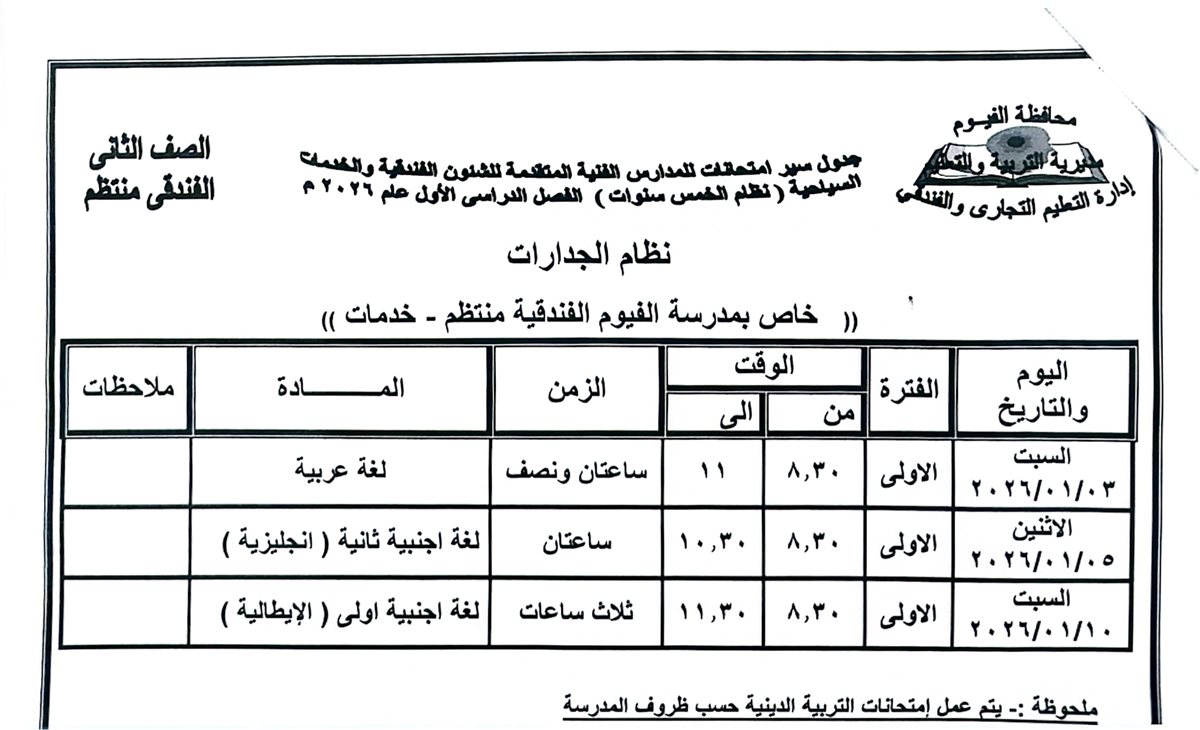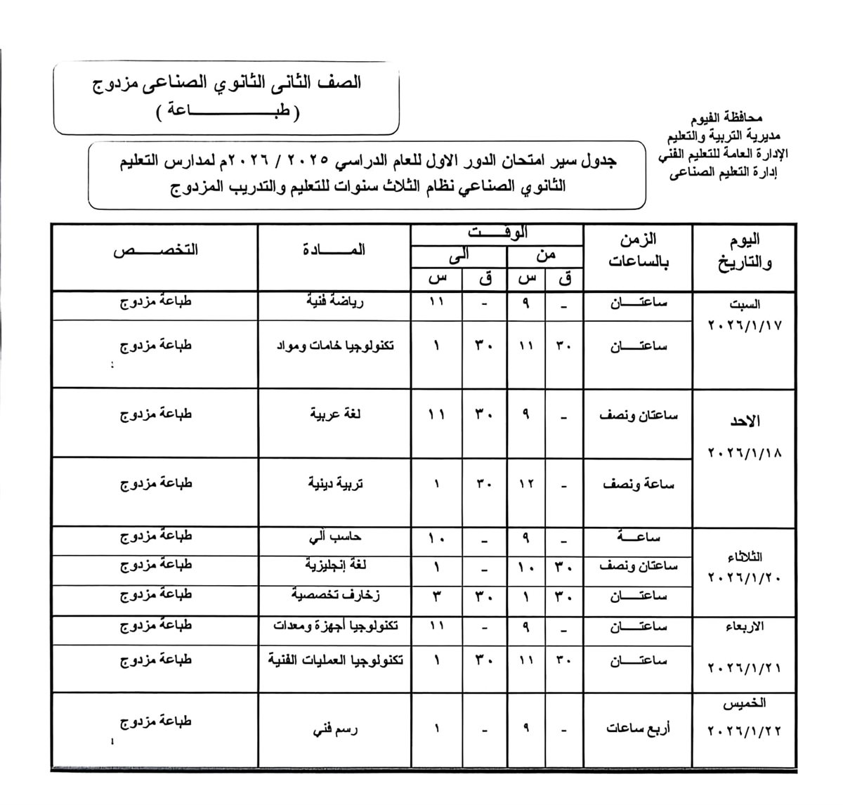 اعتمد الدكتور احمد الانصاري محافظ الفيوم، جداول امتحانات الفصل الدراسي الأول لمدارس التعليم الفني بنوعياته ( تجاري – فندقي ـ زراعي – صناعي – مزدوج )، وتبدأ امتحانات المواد النظرية اعتبارا من يوم 3 يناير المقبل وتنتهي تباعا بحسب نوعية التعليم والبرنامج التعليمي " تجاري 3 سنوات – تجاري 5 سنوات – جدران – مزدوج" و" زراعي – زراعي مهني – زراعي مزدوج - زراعي جدارات "، و"صناعي 3 سنوات، صناعي 5 سنوات – صناعي مهني – صناعي مزدوج ـ صناعي جدارات".