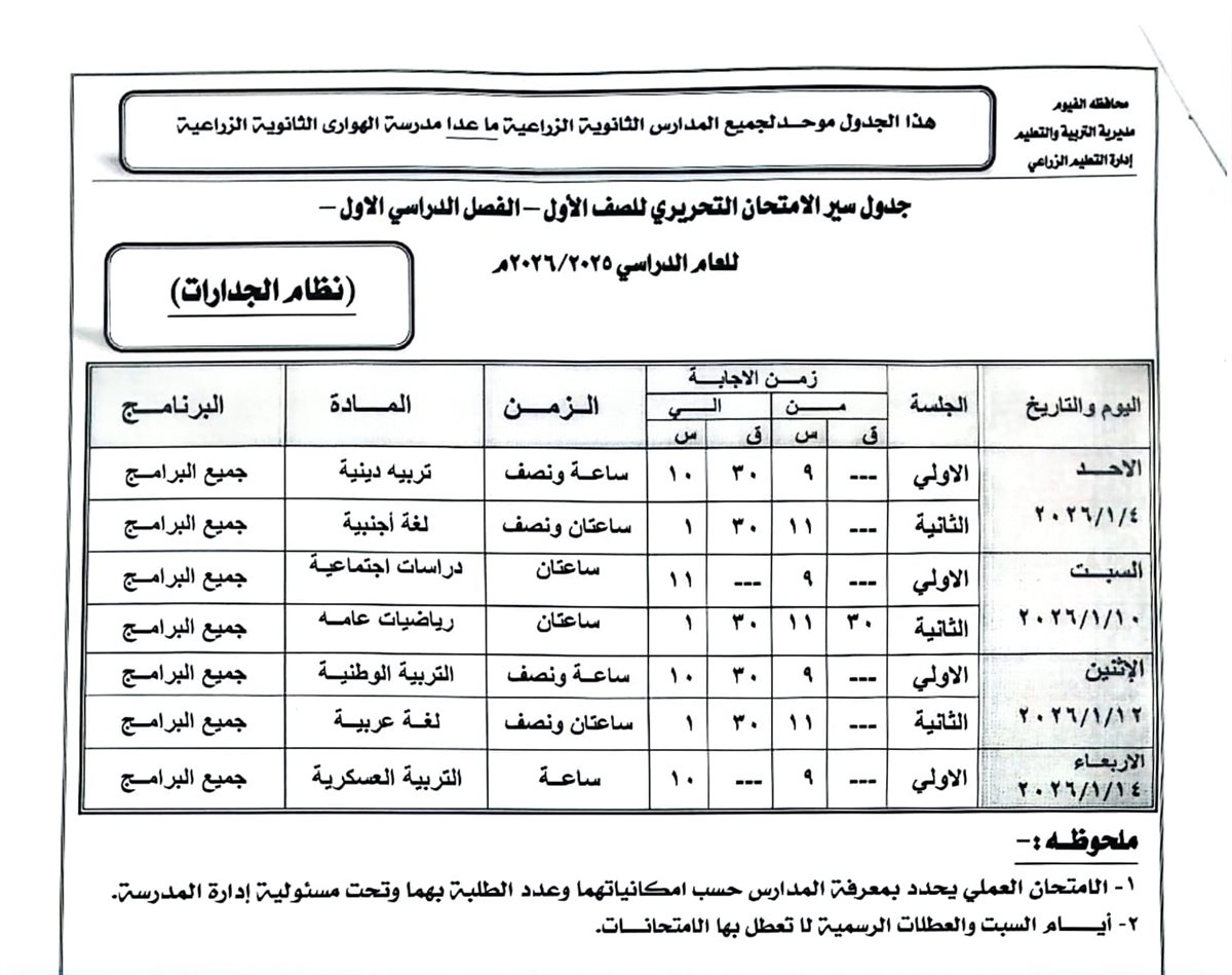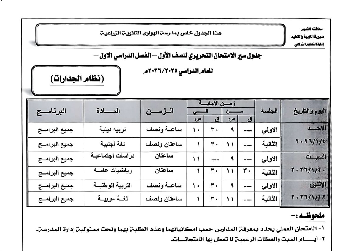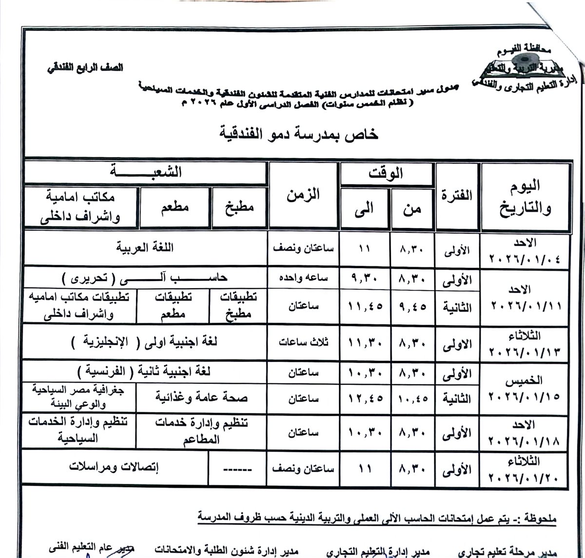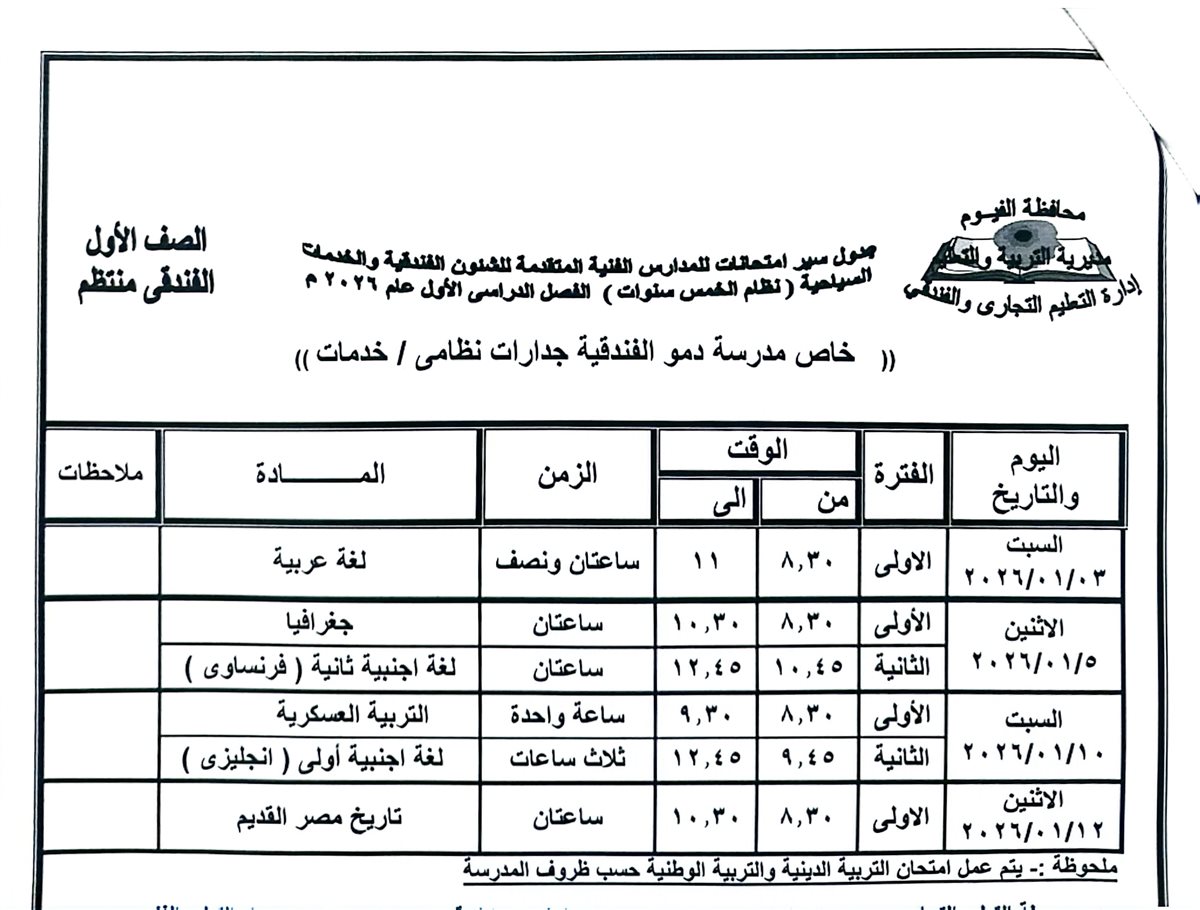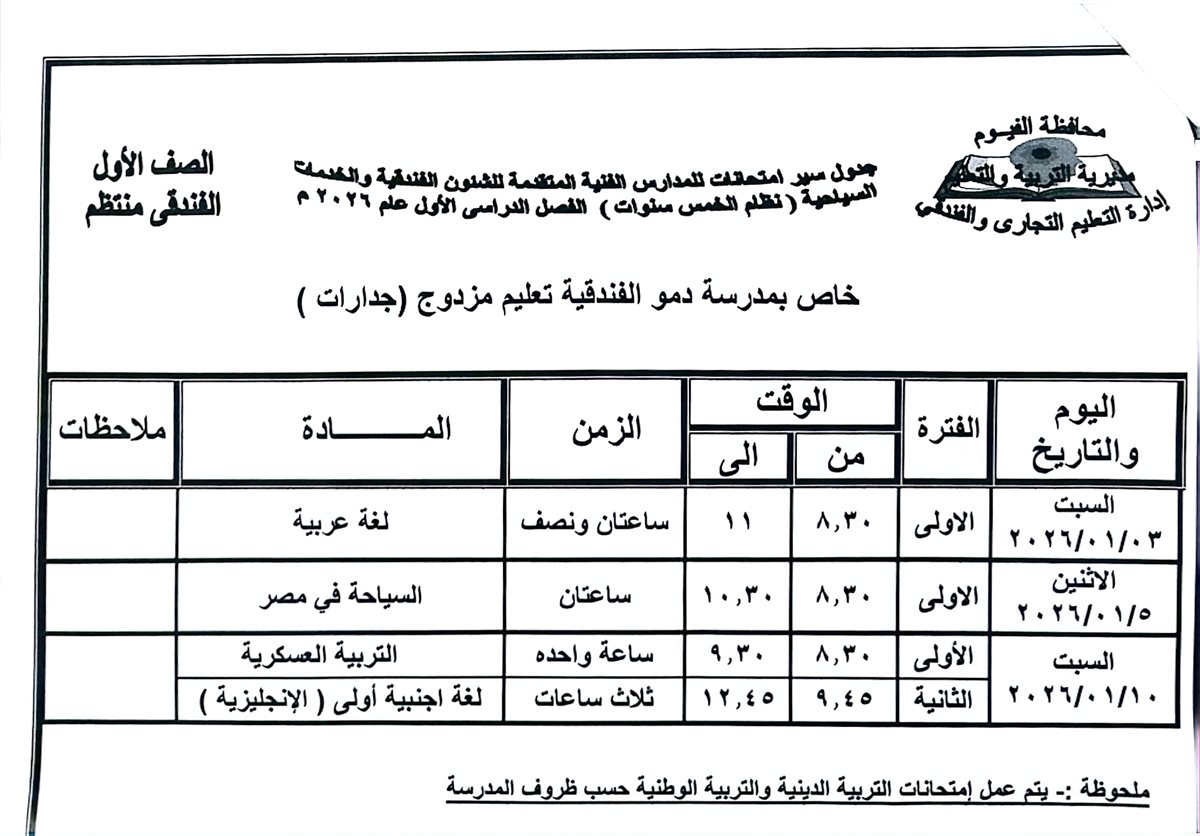 اعتمد الدكتور احمد الانصاري محافظ الفيوم، جداول امتحانات الفصل الدراسي الأول لمدارس التعليم الفني بنوعياته ( تجاري – فندقي ـ زراعي – صناعي – مزدوج )، وتبدأ امتحانات المواد النظرية اعتبارا من يوم 3 يناير المقبل وتنتهي تباعا بحسب نوعية التعليم والبرنامج التعليمي " تجاري 3 سنوات – تجاري 5 سنوات – جدران – مزدوج" و" زراعي – زراعي مهني – زراعي مزدوج - زراعي جدارات "، و"صناعي 3 سنوات، صناعي 5 سنوات – صناعي مهني – صناعي مزدوج ـ صناعي جدارات".