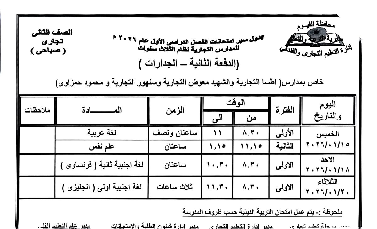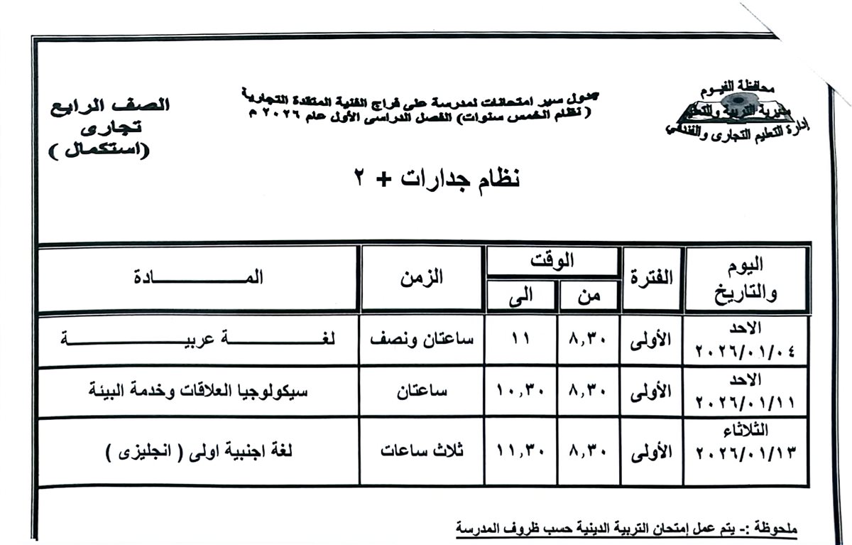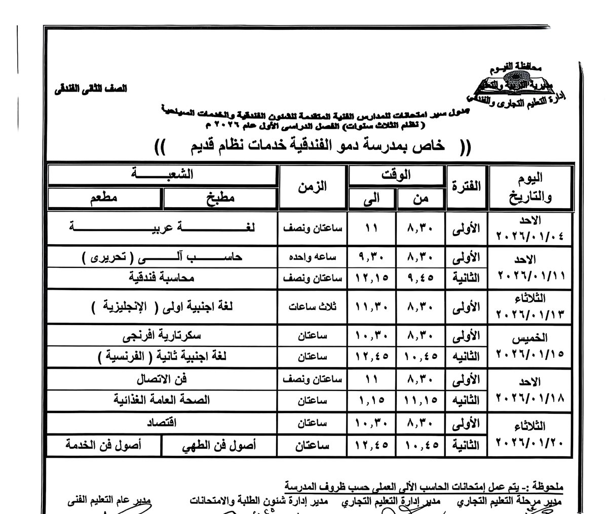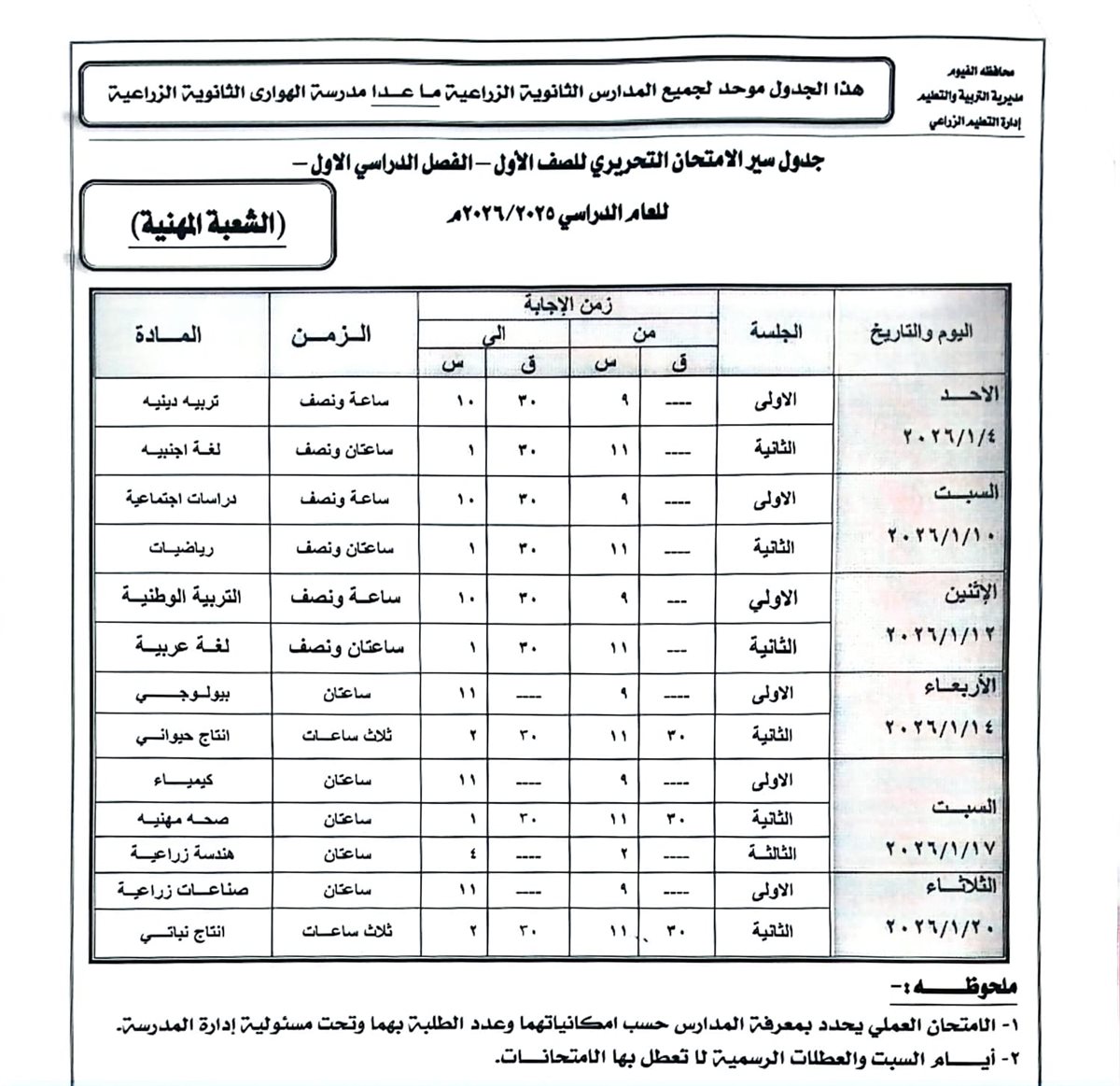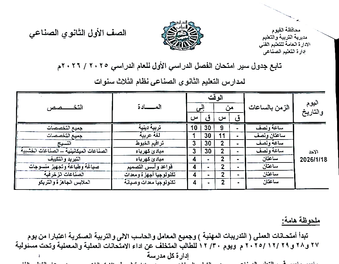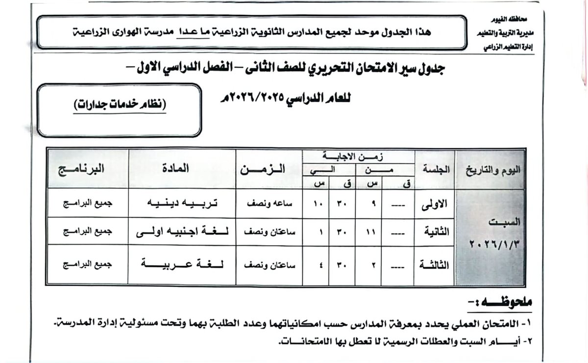 اعتمد الدكتور احمد الانصاري محافظ الفيوم، جداول امتحانات الفصل الدراسي الأول لمدارس التعليم الفني بنوعياته ( تجاري – فندقي ـ زراعي – صناعي – مزدوج )، وتبدأ امتحانات المواد النظرية اعتبارا من يوم 3 يناير المقبل وتنتهي تباعا بحسب نوعية التعليم والبرنامج التعليمي " تجاري 3 سنوات – تجاري 5 سنوات – جدران – مزدوج" و" زراعي – زراعي مهني – زراعي مزدوج - زراعي جدارات "، و"صناعي 3 سنوات، صناعي 5 سنوات – صناعي مهني – صناعي مزدوج ـ صناعي جدارات".