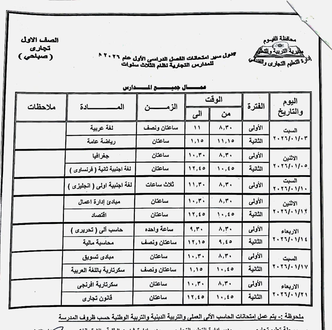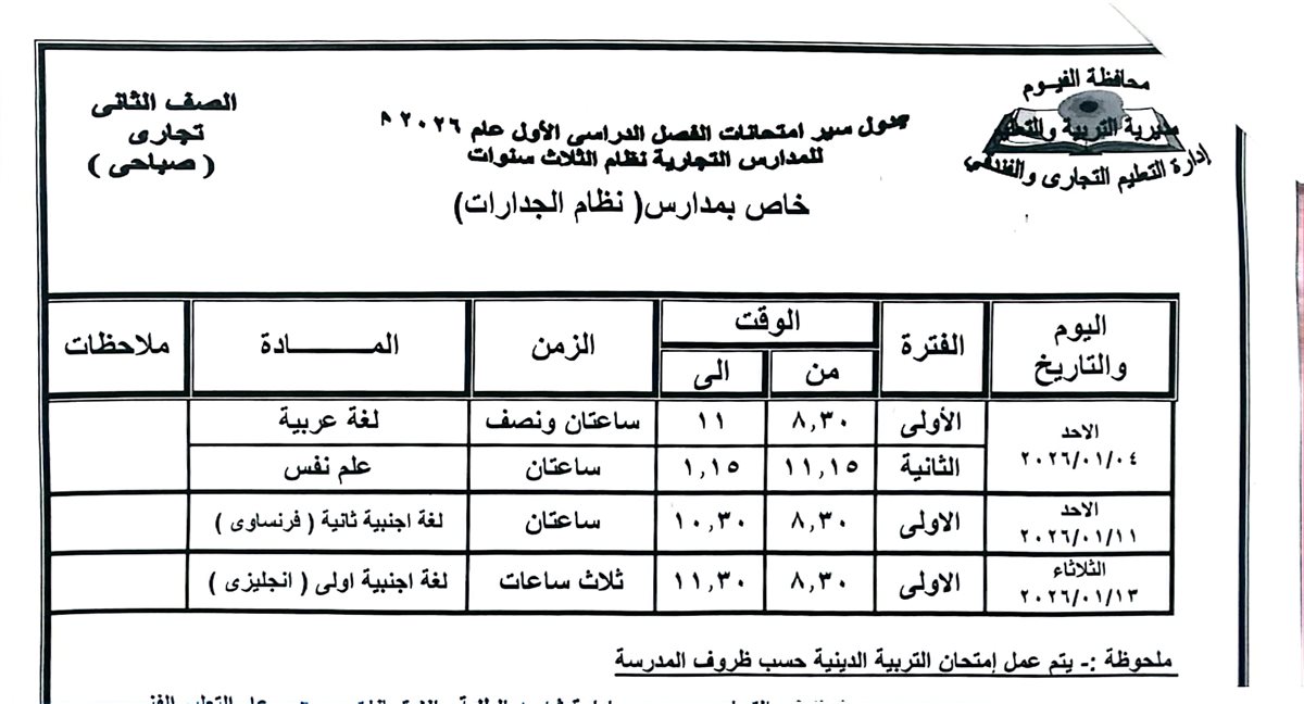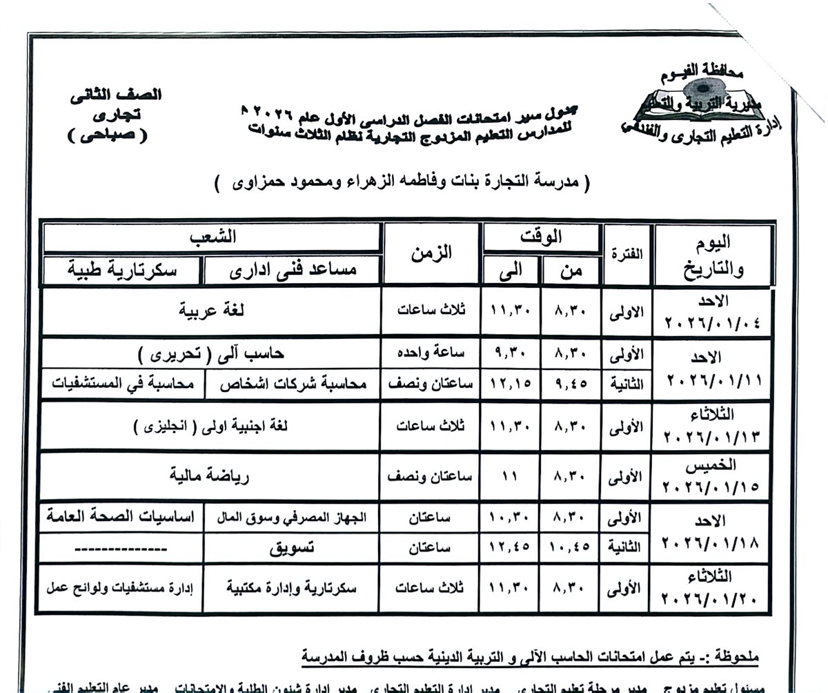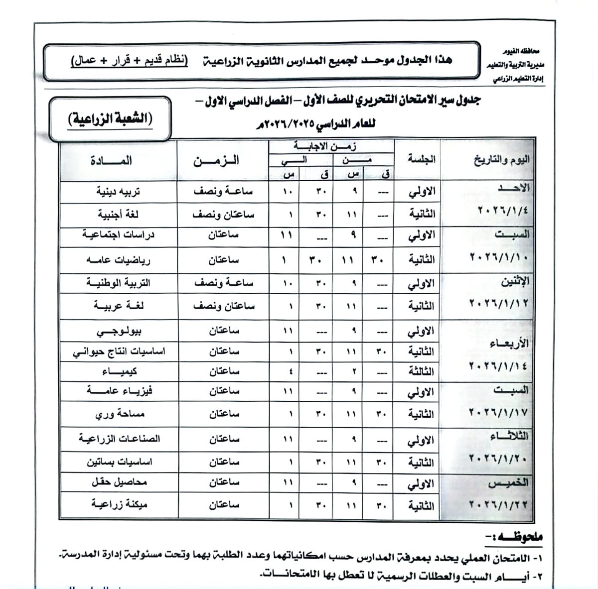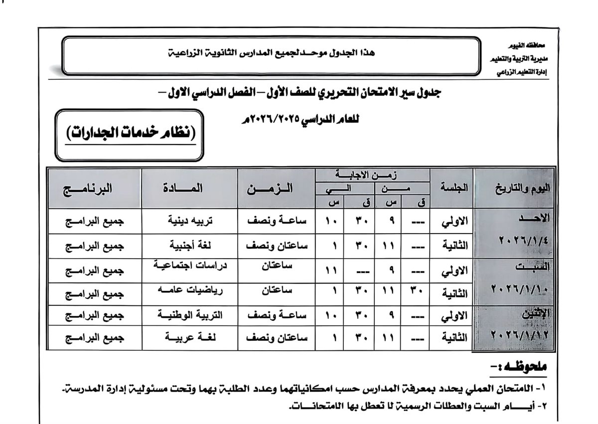 اعتمد الدكتور احمد الانصاري محافظ الفيوم، جداول امتحانات الفصل الدراسي الأول لمدارس التعليم الفني بنوعياته ( تجاري – فندقي ـ زراعي – صناعي – مزدوج )، وتبدأ امتحانات المواد النظرية اعتبارا من يوم 3 يناير المقبل وتنتهي تباعا بحسب نوعية التعليم والبرنامج التعليمي " تجاري 3 سنوات – تجاري 5 سنوات – جدران – مزدوج" و" زراعي – زراعي مهني – زراعي مزدوج - زراعي جدارات "، و"صناعي 3 سنوات، صناعي 5 سنوات – صناعي مهني – صناعي مزدوج ـ صناعي جدارات".