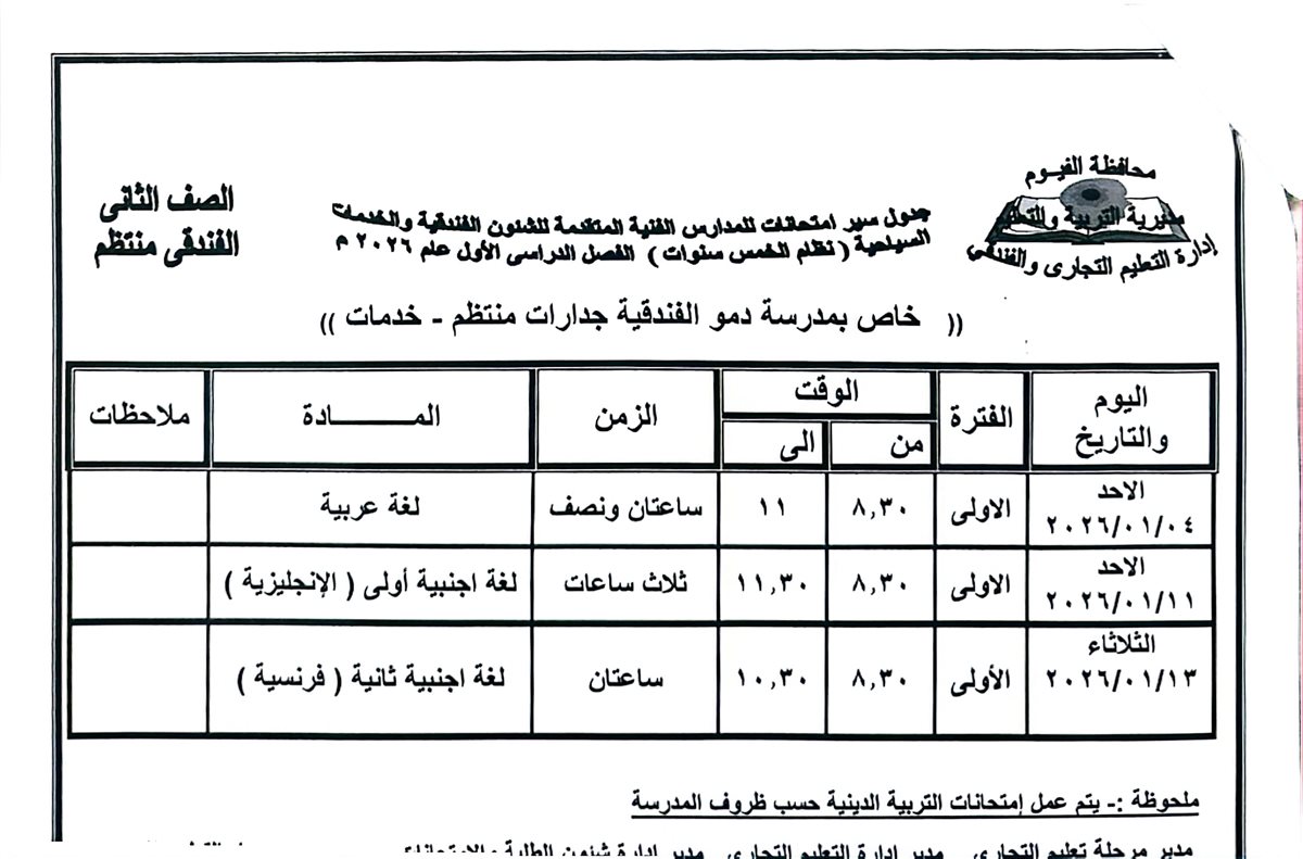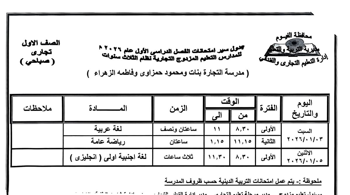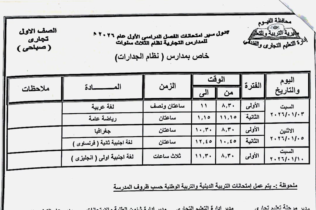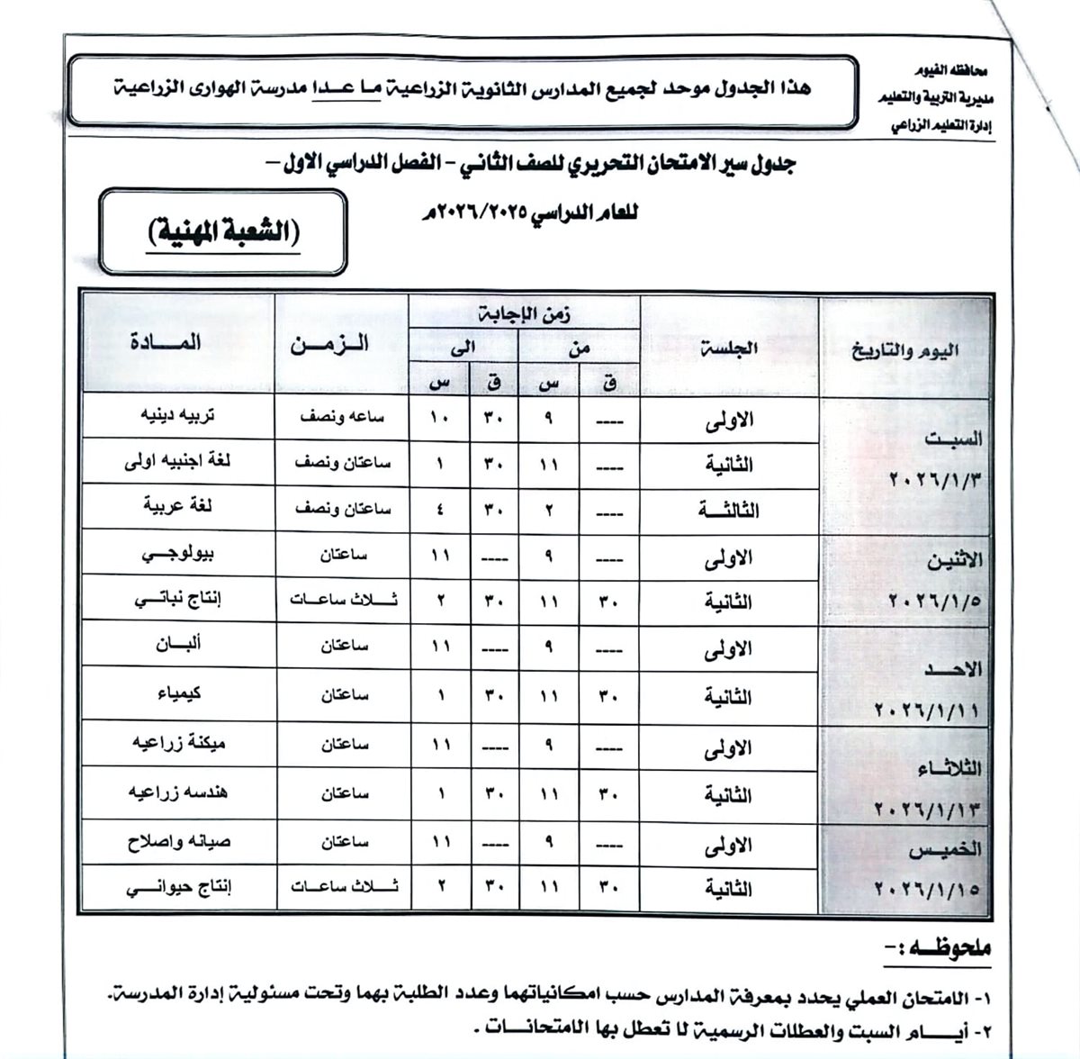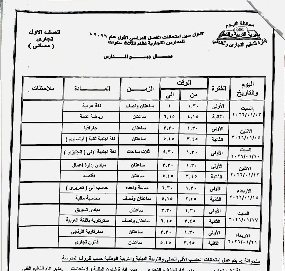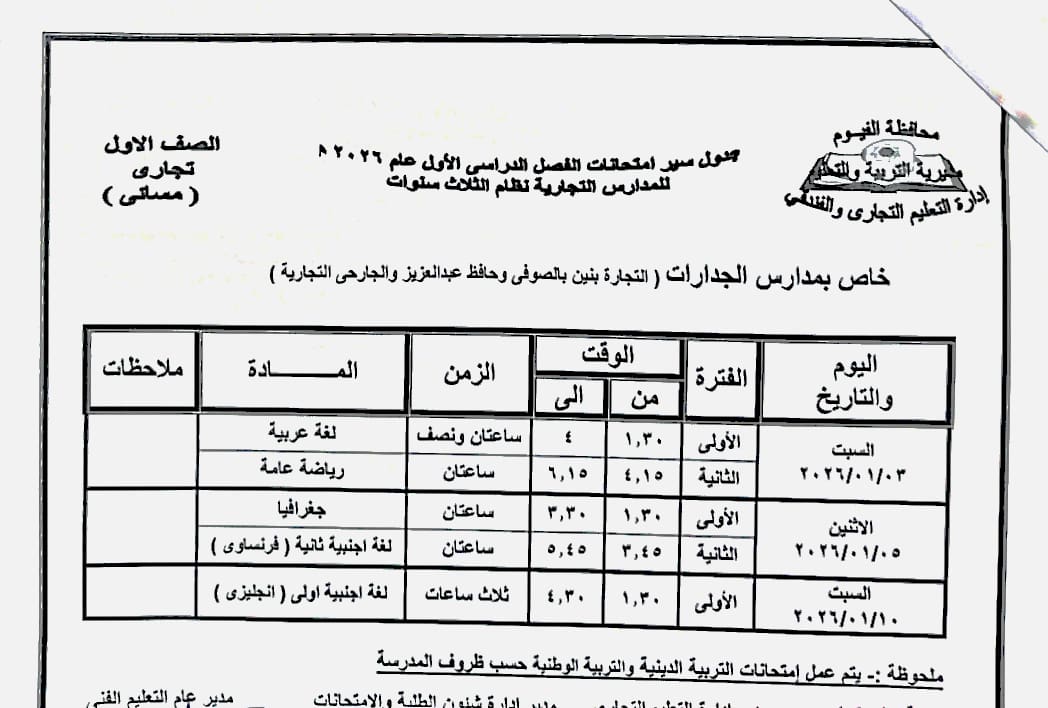 اعتمد الدكتور احمد الانصاري محافظ الفيوم، جداول امتحانات الفصل الدراسي الأول لمدارس التعليم الفني بنوعياته ( تجاري – فندقي ـ زراعي – صناعي – مزدوج )، وتبدأ امتحانات المواد النظرية اعتبارا من يوم 3 يناير المقبل وتنتهي تباعا بحسب نوعية التعليم والبرنامج التعليمي " تجاري 3 سنوات – تجاري 5 سنوات – جدران – مزدوج" و" زراعي – زراعي مهني – زراعي مزدوج - زراعي جدارات "، و"صناعي 3 سنوات، صناعي 5 سنوات – صناعي مهني – صناعي مزدوج ـ صناعي جدارات".