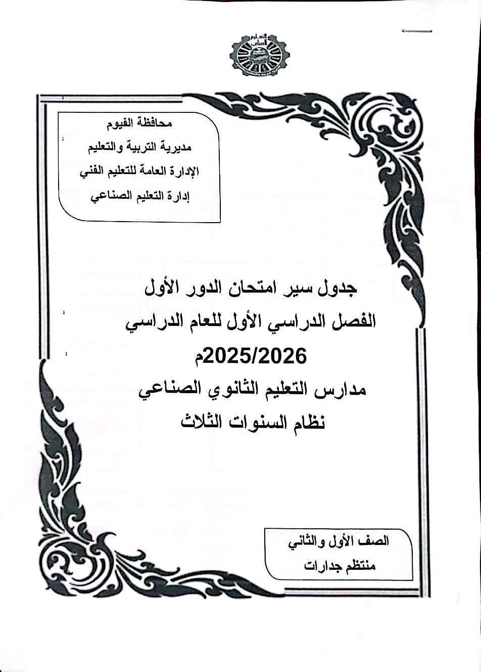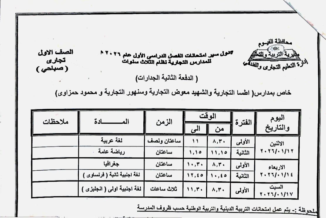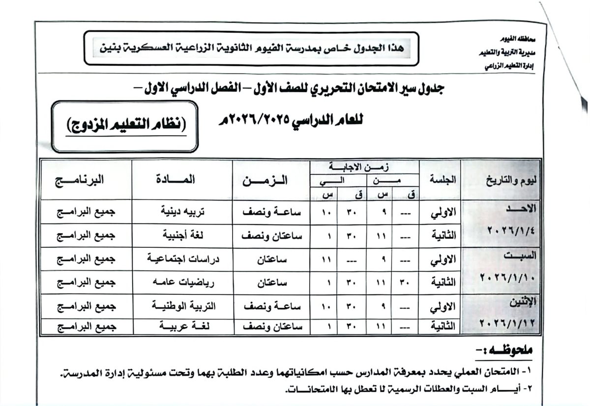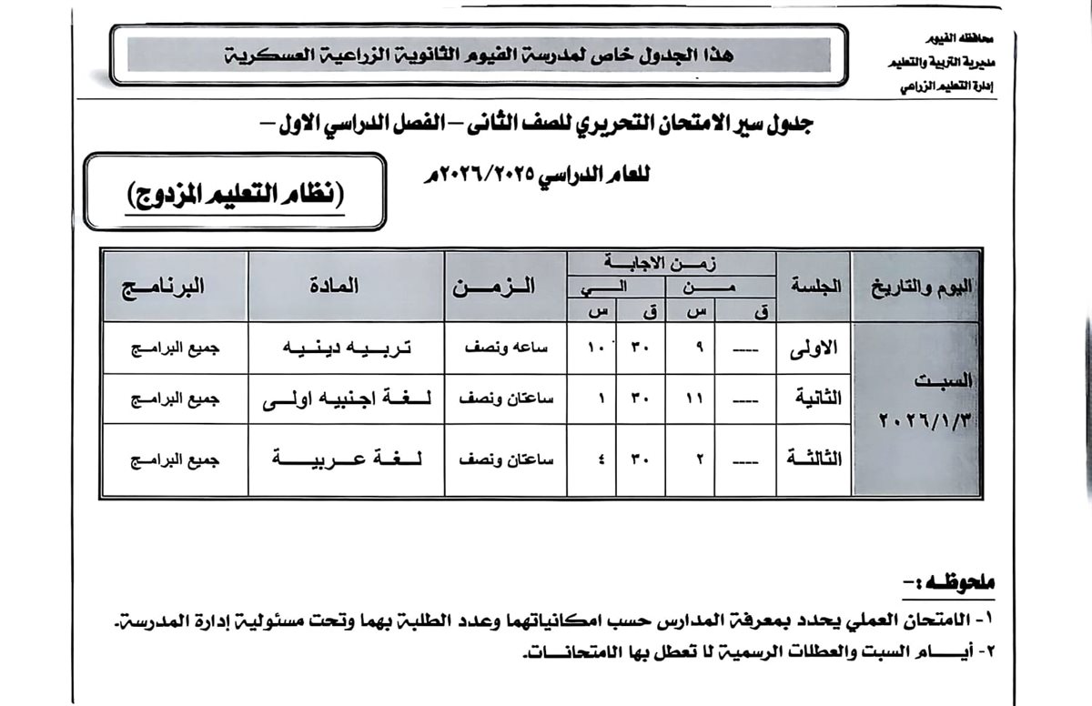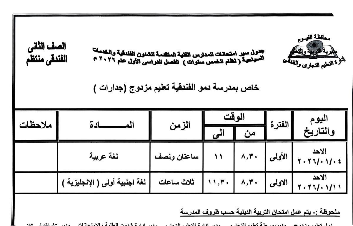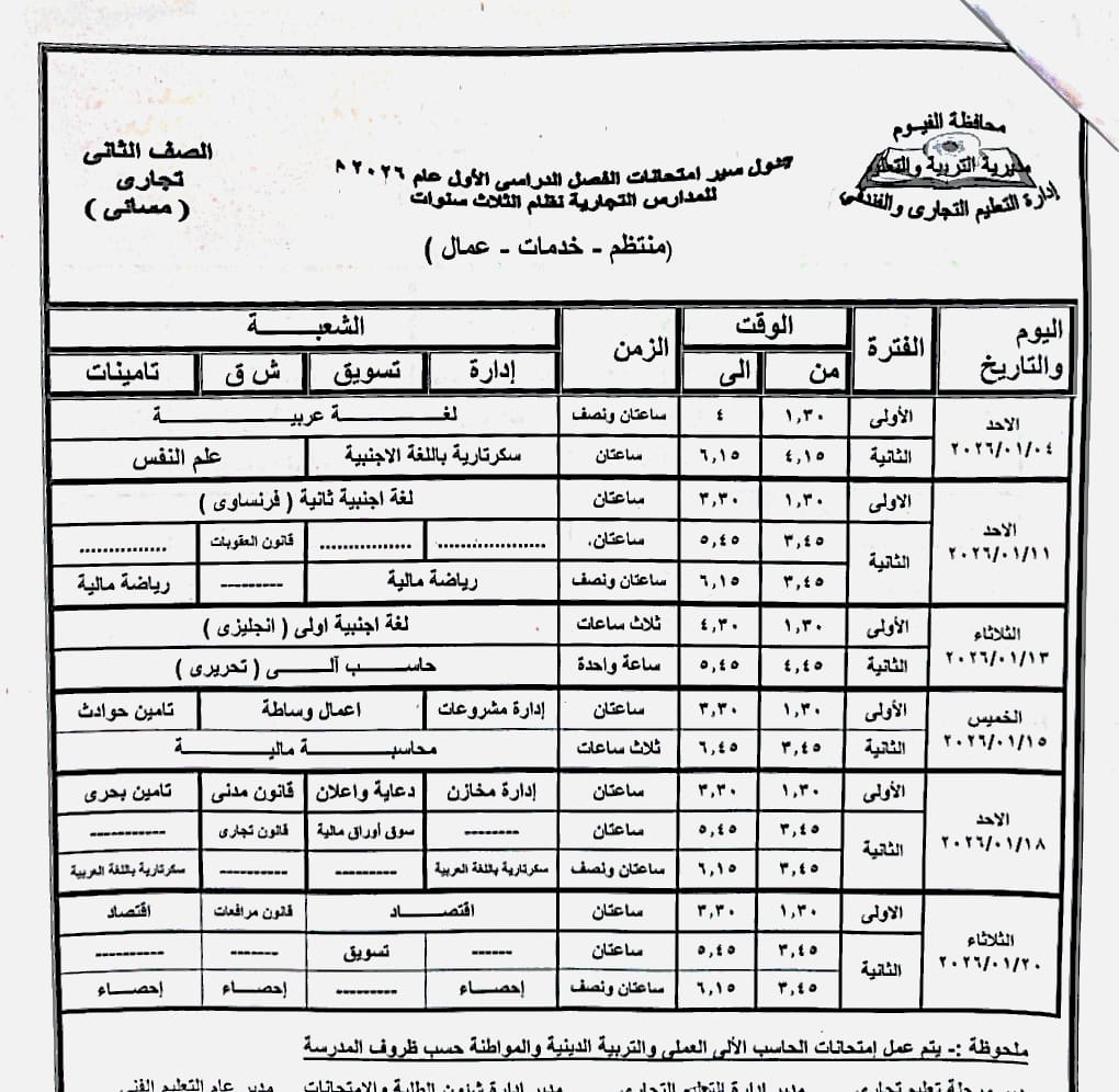 اعتمد الدكتور احمد الانصاري محافظ الفيوم، جداول امتحانات الفصل الدراسي الأول لمدارس التعليم الفني بنوعياته ( تجاري – فندقي ـ زراعي – صناعي – مزدوج )، وتبدأ امتحانات المواد النظرية اعتبارا من يوم 3 يناير المقبل وتنتهي تباعا بحسب نوعية التعليم والبرنامج التعليمي " تجاري 3 سنوات – تجاري 5 سنوات – جدران – مزدوج" و" زراعي – زراعي مهني – زراعي مزدوج - زراعي جدارات "، و"صناعي 3 سنوات، صناعي 5 سنوات – صناعي مهني – صناعي مزدوج ـ صناعي جدارات".