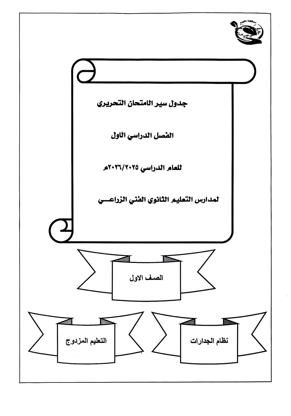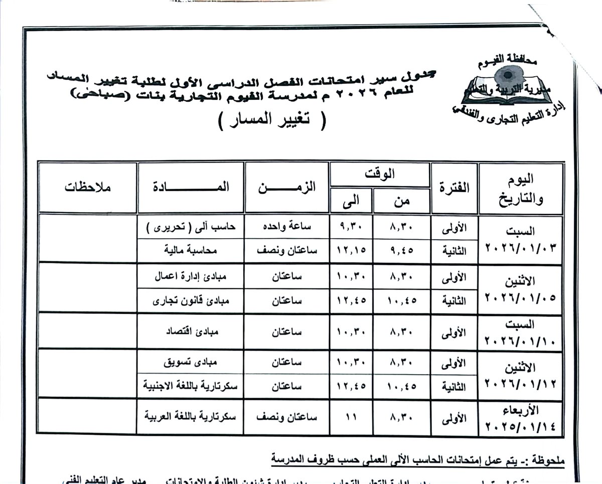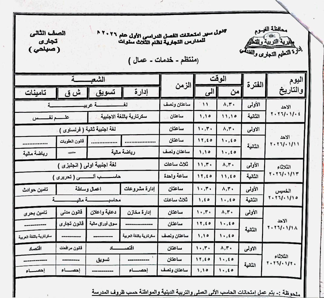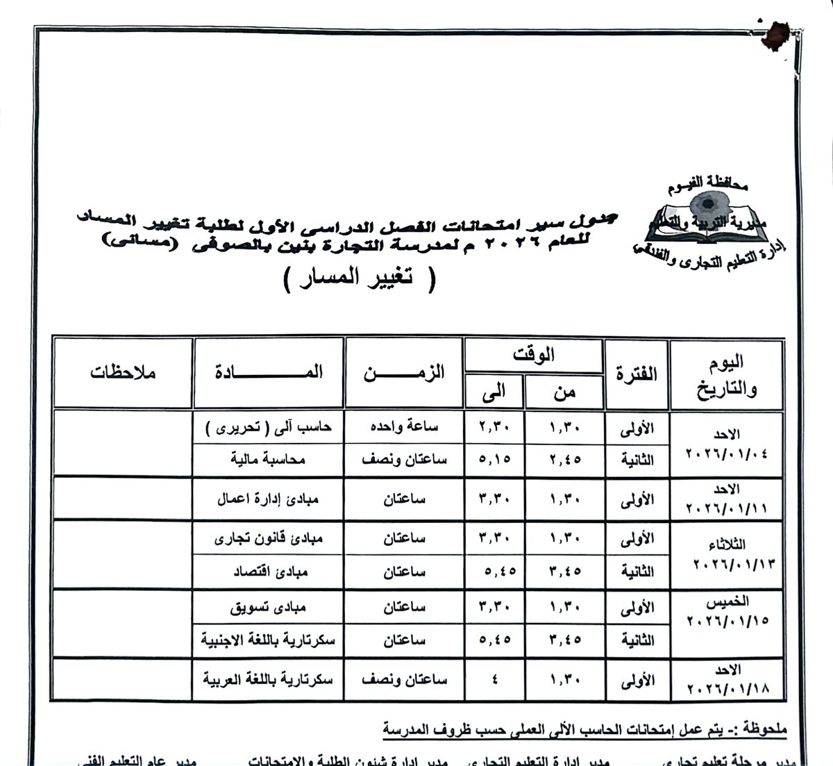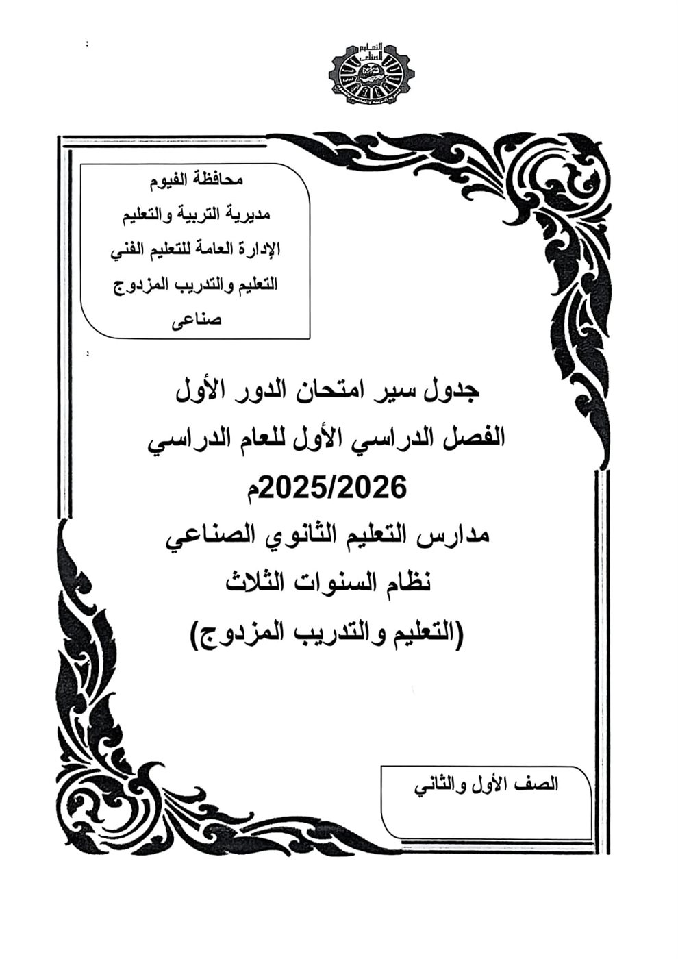 اعتمد الدكتور احمد الانصاري محافظ الفيوم، جداول امتحانات الفصل الدراسي الأول لمدارس التعليم الفني بنوعياته ( تجاري – فندقي ـ زراعي – صناعي – مزدوج )، وتبدأ امتحانات المواد النظرية اعتبارا من يوم 3 يناير المقبل وتنتهي تباعا بحسب نوعية التعليم والبرنامج التعليمي " تجاري 3 سنوات – تجاري 5 سنوات – جدران – مزدوج" و" زراعي – زراعي مهني – زراعي مزدوج - زراعي جدارات "، و"صناعي 3 سنوات، صناعي 5 سنوات – صناعي مهني – صناعي مزدوج ـ صناعي جدارات".