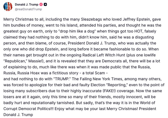 وكتب ترامب، عبر منصته "تروث سوشيال" للتواصل الاجتماعي: "عيد ميلاد مجيد للجميع، بمن فيهم الكثير من الانتهازيين الذين أحبوا جيفري إبستين، وأغدقوا عليه الأموال، وذهبوا إلى جزيرته، وحضروا حفلاته".