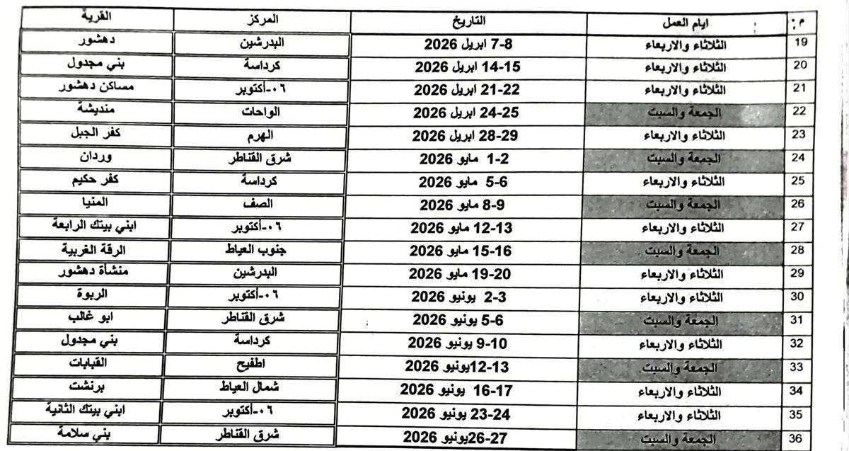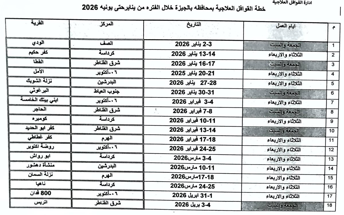 وتبدأ خطة القوافل خلال شهر يناير 2026 بقرية الودي بمركز الصف يومي الجمعة والسبت 2 و3 يناير، ثم قرية كفر حكيم بمركز كرداسة يومي الثلاثاء والأربعاء 13 و14 يناير، وقرية القطا بمركز منشأة القناطر يومي الجمعة والسبت 16 و17 يناير، ومنطقة الأمل بمدينة السادس من أكتوبر يومي الثلاثاء والأربعاء 20 و21 يناير، وقرية نزلة الشوبك بمركز البدرشين يومي الثلاثاء والأربعاء 27 و28 يناير، على أن تختتم قوافل الشهر بقرية البرغوثي بمركز العياط يومي الجمعة والسبت 30 و31 يناير.