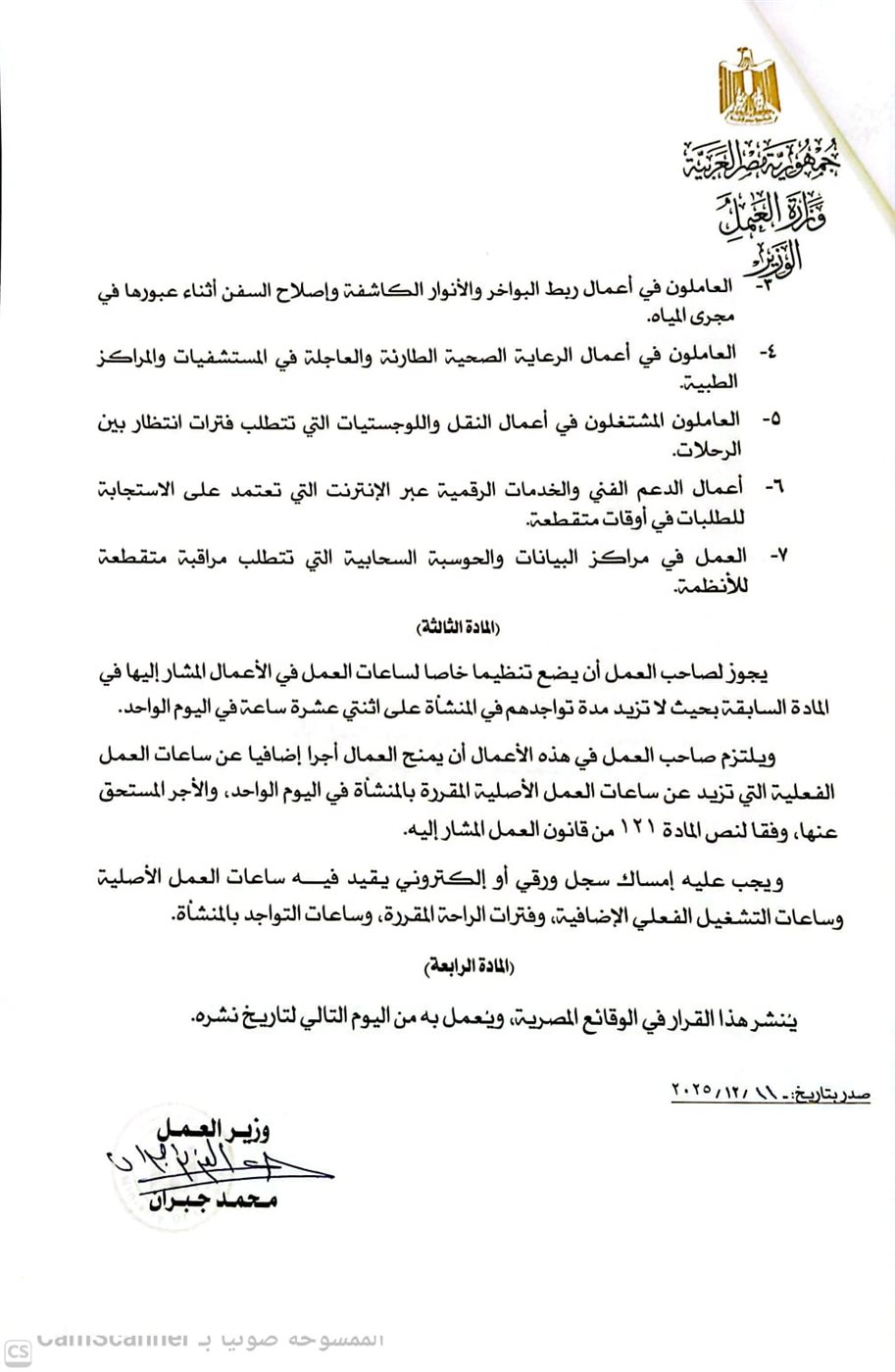 وأوضح الوزير أن القرار يضع ضوابط واضحة لتنظيم ساعات العمل وفترات الراحة، مع استثناء الأعمال المتقطعة بطبيعتها من الحد الأقصى العام لساعات التواجد، على ألا يزيد تواجد العامل في هذه الحالات على اثنتي عشرة ساعة يوميًا، مع الالتزام الكامل بصرف الأجور الإضافية المستحقة عن ساعات العمل الفعلية الزائدة، وفقًا لأحكام قانون العمل.