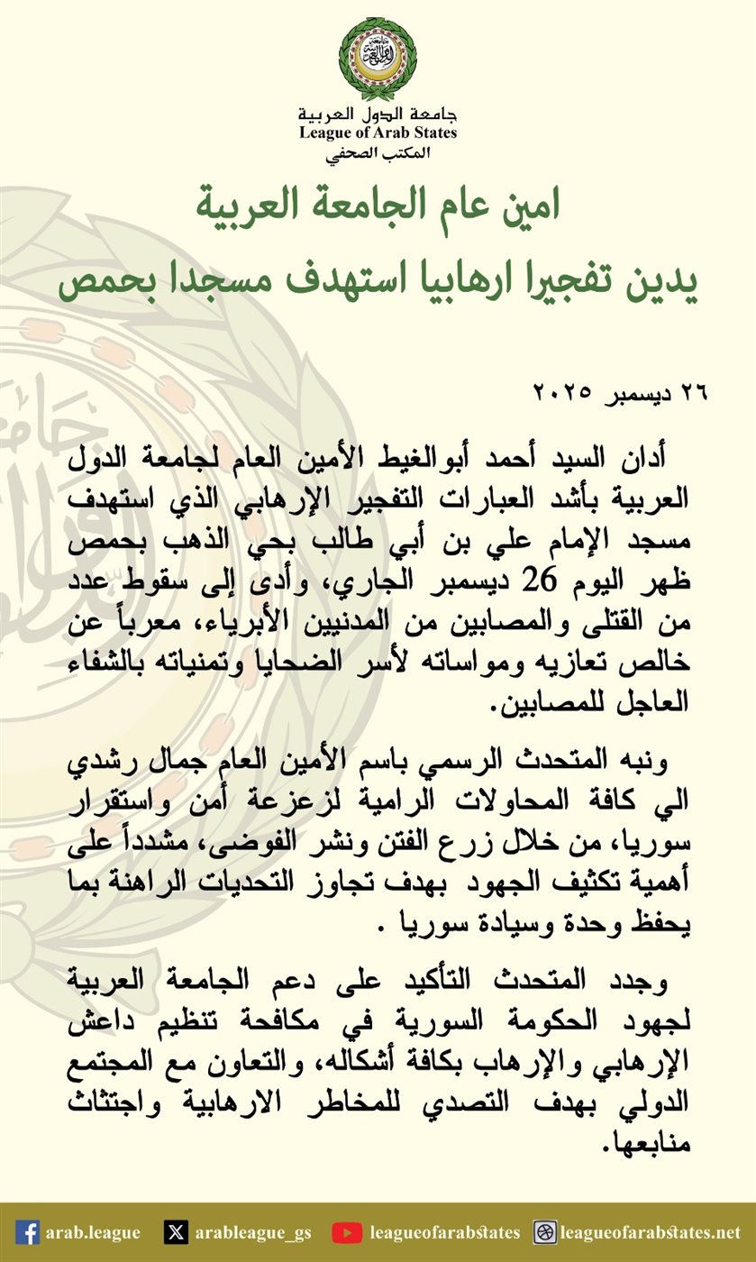 أدان أحمد أبو الغيط، الأمين العام لجامعة الدول العربية، بأشد العبارات التفجير الإرهابي الذي استهدف مسجد الإمام علي بن أبي طالب في حي الذهب بمدينة حمص، ظهر يوم السادس والعشرين من ديسمبر الجاري، وأسفر عن سقوط قتلى ومصابين من المدنيين الأبرياء.