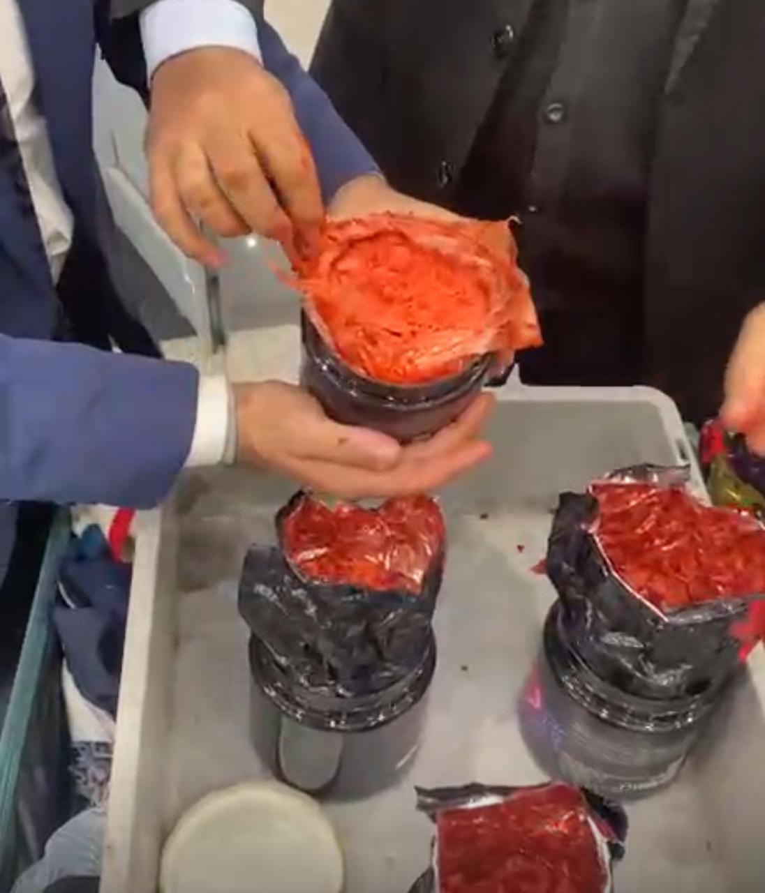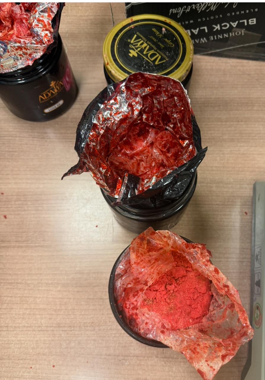 وقام خالد شعبان مدير إدارة الحركة المشرف على صالة الوصول بمبنى 2 بتكليف مينا فهيم مأمور الجمرك، بتفتيش حقائب الراكب على جهاز الفحص بالأشعة، والذي تلاحظ له وجود عبوات يشتبه أن يكون بها مواد عضوية تم تكليف سامي نبيل مأمور الجمرك، بتفتيش حقائب الراكب يدويا مما أسفر عن ضبط 4 عبوات(برطمانات) بهم مواد ورديه اللون يشتبه أن تكون مواد مخدرة مع بعض المعسل.