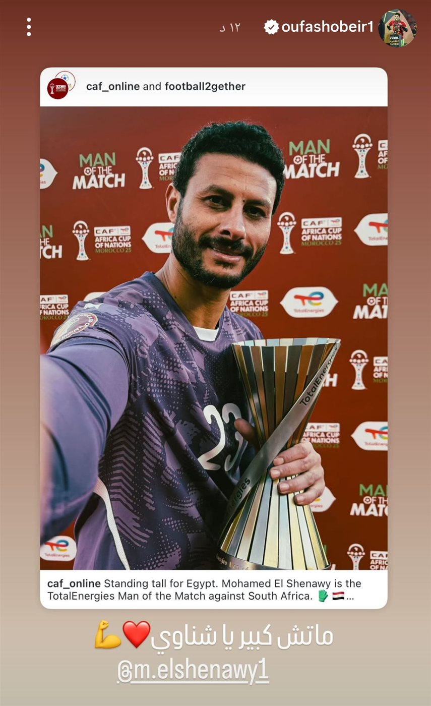 ونشر مصطفي شوبير عبر ستوري علي حسابه صورة للنشاوي بجائزة رجل المباراة، وعلق عليها قائلا:" ماتش كبير يا شناوي.