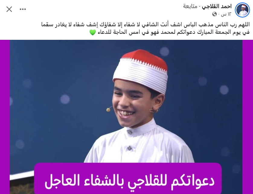 تصدر اسم القارئ الطفل محمد القلاجي مواقع التواصل الاجتماعي خلال الساعات الماضية، وذلك بعدما طالب والده أحمد حسن إسماعيل، جمهوره ومتابعيه بالدعاء لنجله بعد تعرضه لوعكة صحية شديدة، مؤكدًا أن حالته تستدعي الدعاء في هذا التوقيت.