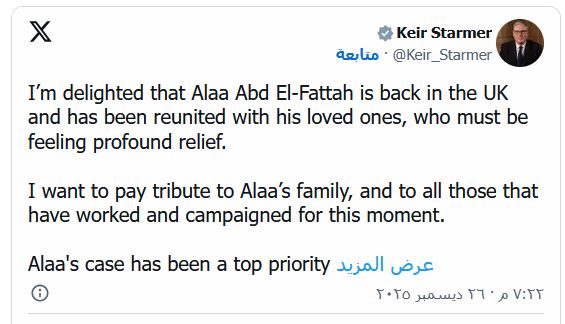 وقال ستارمر، عبر منصة "إكس" (تويتر سابقًا): "يسعدني عودة علاء عبدالفتاح إلى المملكة المتحدة واجتماعه بأحبائه، الذين لا شك أنهم يشعرون براحة كبيرة".