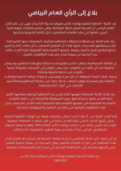 اللجنة المنظمة لأمم أفريقيا تمنع دخول الجماهير مجانا لملعب أغادير