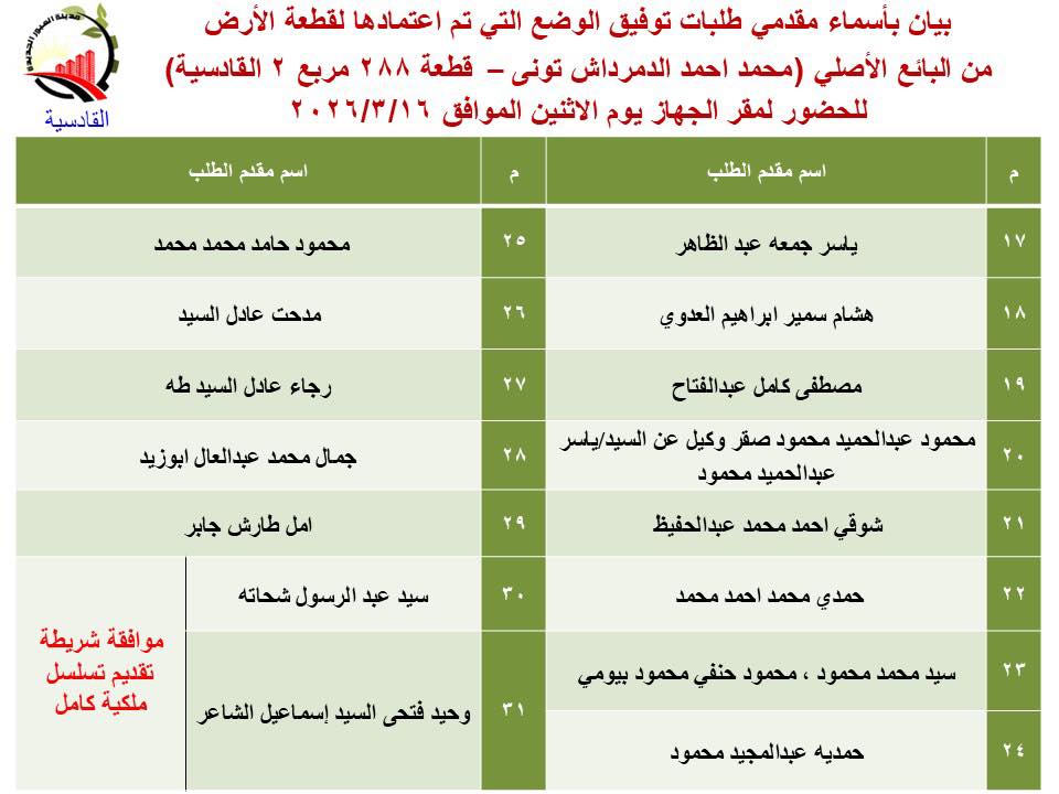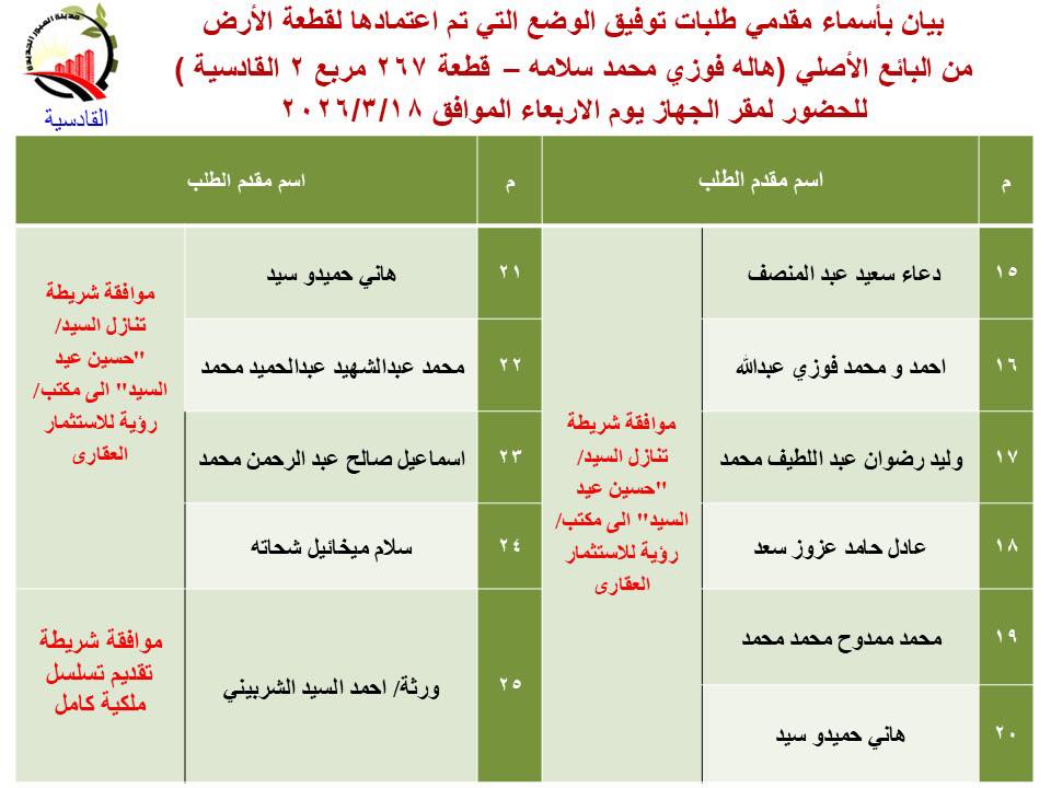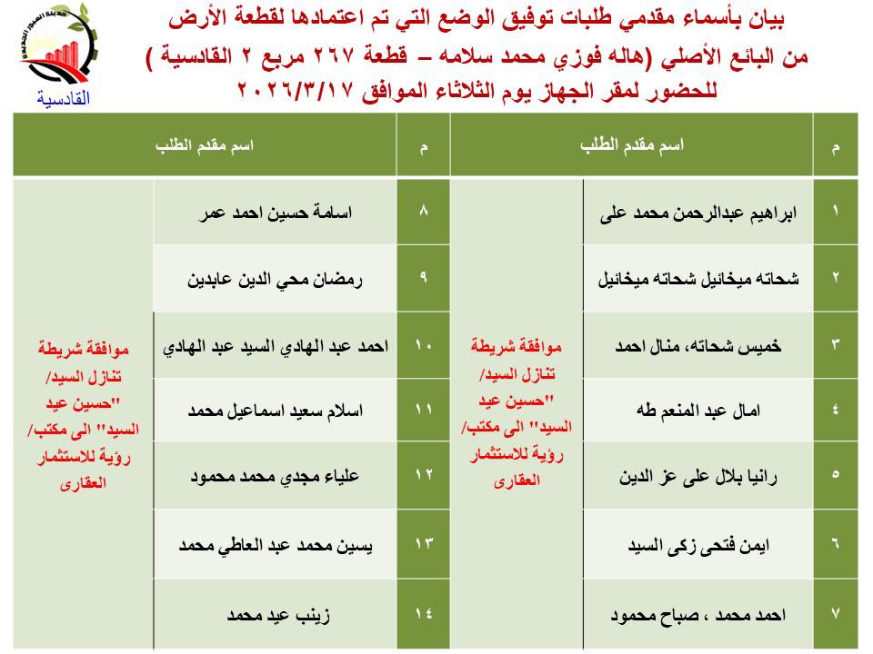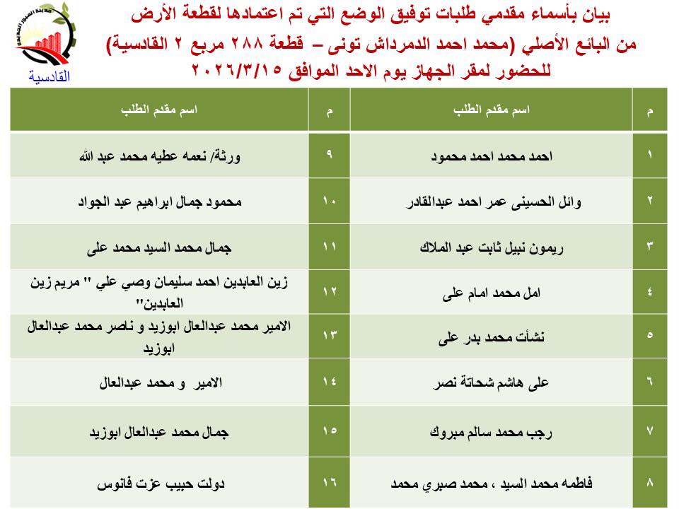 كشفت وزارة الإسكان والمرافق والمجتمعات العمرانية عن تقنين دفعة جديدة من أراضي المواطنين بمنطقة القادسية بمدينة العبور الجديدة، الذين تم اعتماد توفيق أوضاع أراضيهم لاستكمال إجراءات التقنين.