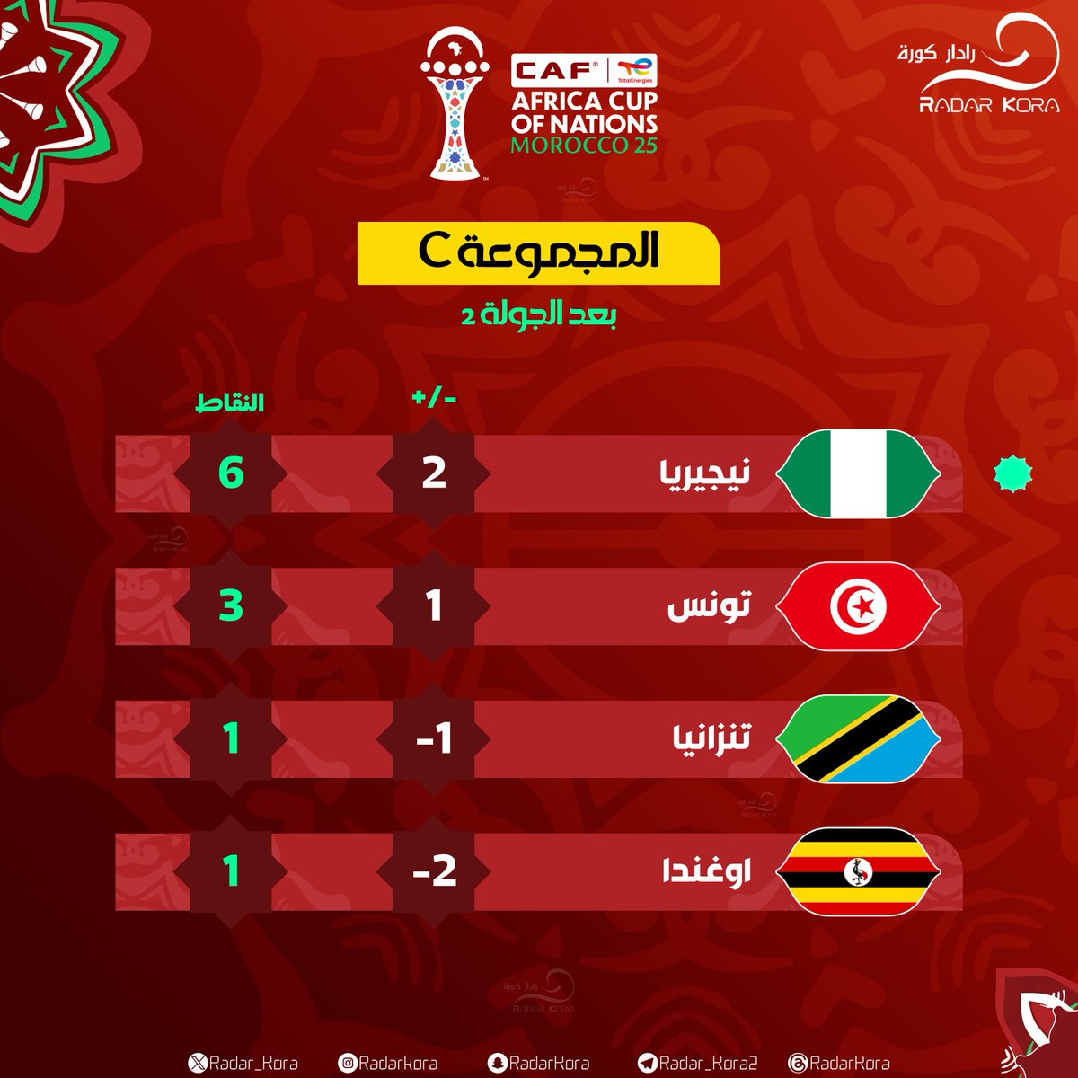ترتيب المجموعة الثالثة لكأس أمم إفريقيا بعد خسارة تونس أمام نيجيريا