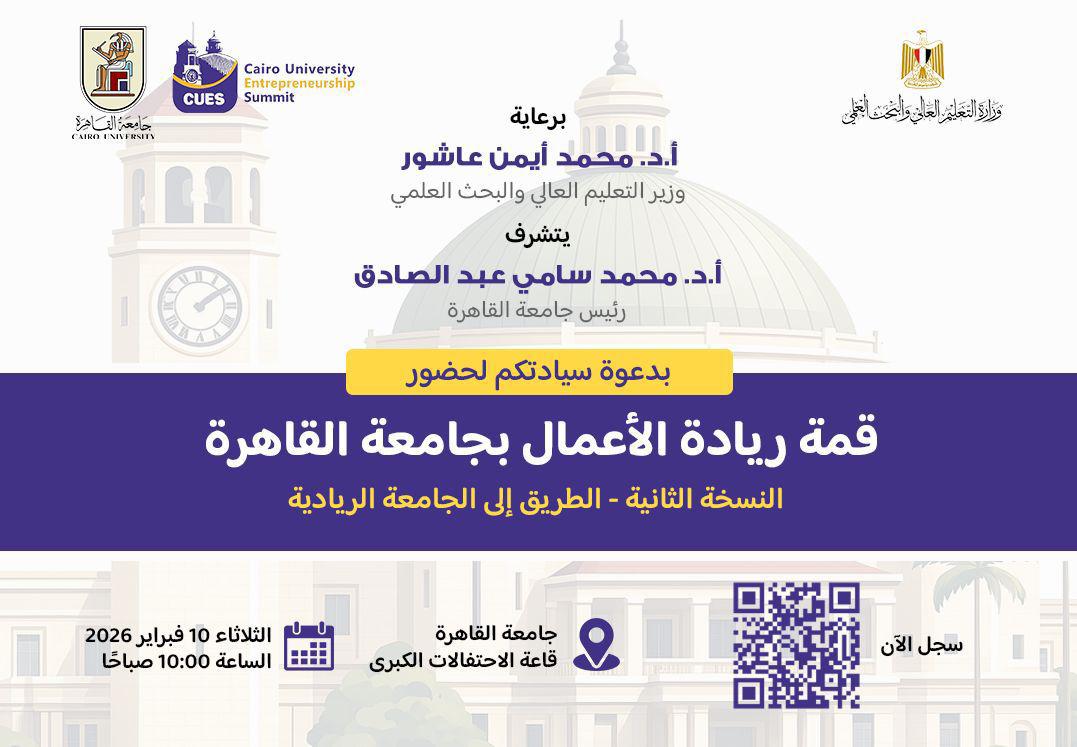 أعلنت جامعة القاهرة عن إطلاق النسخة الثانية من قمة ريادة الأعمال بجامعة القاهرة، والمقرر انعقادها يوم الثلاثاء الموافق 10 فبراير المقبل، في تمام الساعة العاشرة صباحًا، بقاعة الاحتفالات الكبرى بالجامعة، وذلك في إطار التزامها بدعم منظومة الابتكار وريادة الأعمال، وتعزيز التكامل بين التعليم الأكاديمي وقطاعات الأعمال والصناعة.
