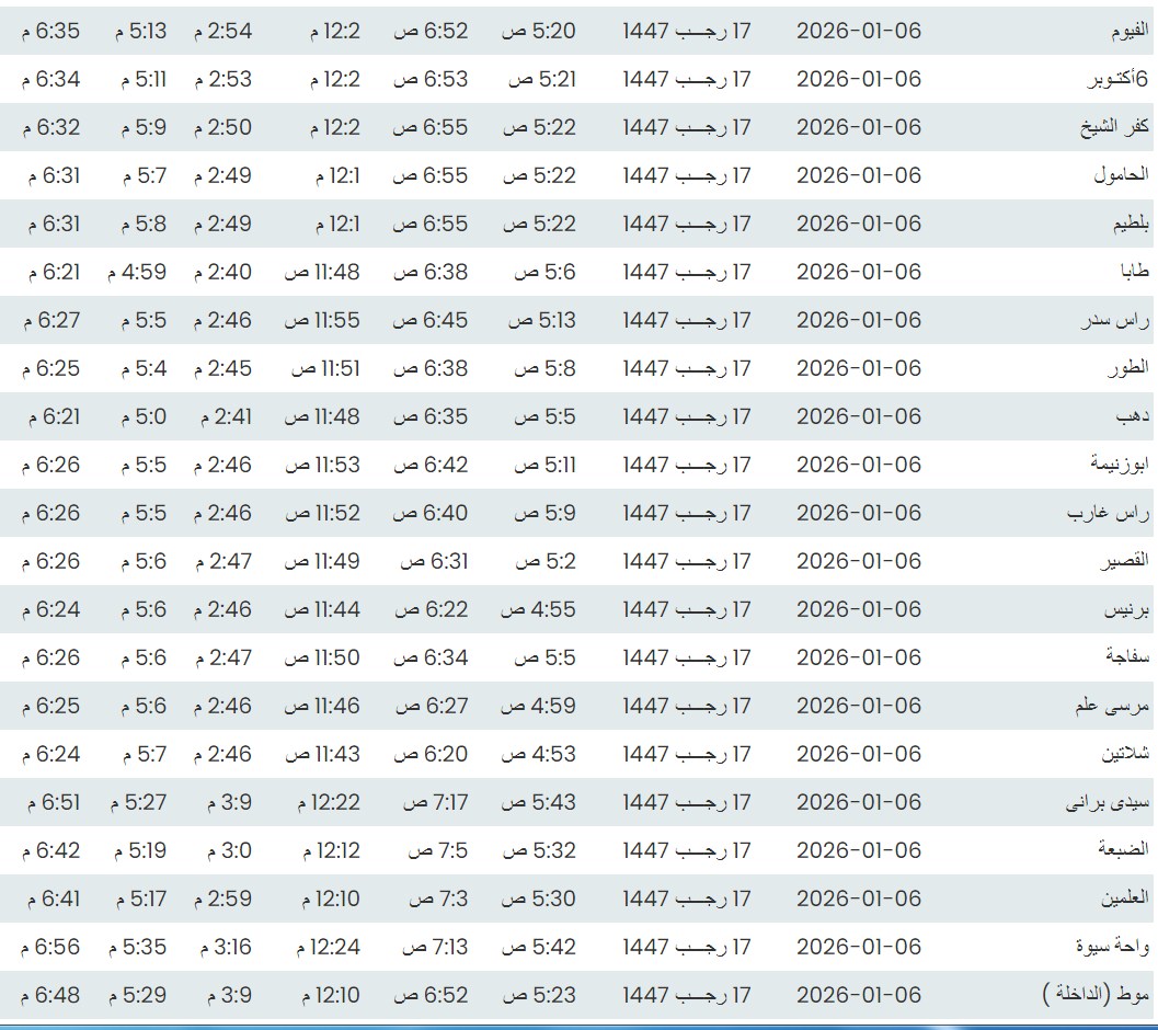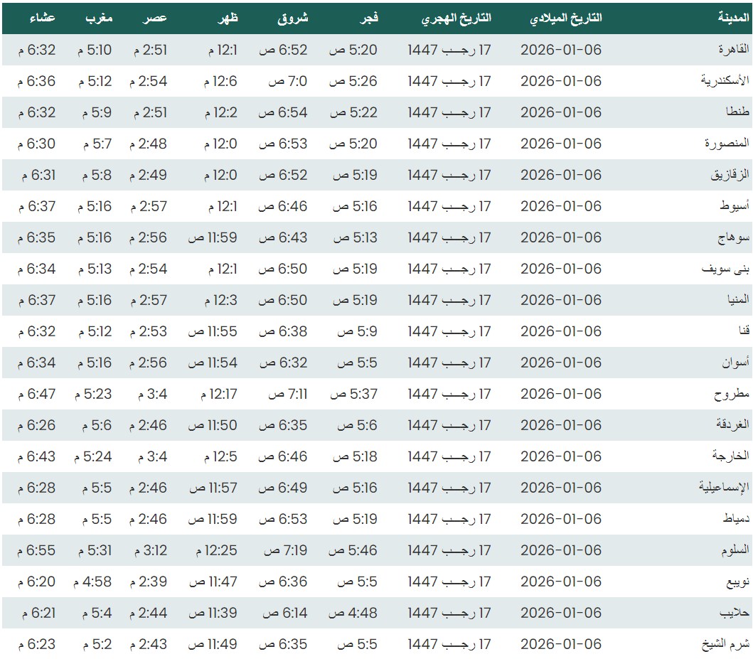 وفيما يلي مواقيت الصلاة، لعدد من مدن ومحافظات الجمهورية من واقع بيانات الهيئة العامة للمساحة