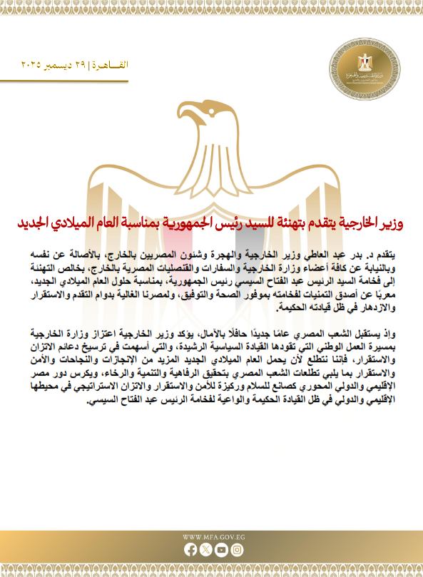 تقدم الدكتور بدر عبد العاطي وزير الخارجية والهجرة وشئون المصريين بالخارج، بالأصالة عن نفسه وبالنيابة عن كافة أعضاء وزارة الخارجية والسفارات والقنصليات المصرية بالخارج، بخالص التهنئة إلى الرئيس عبد الفتاح السيسي، بمناسبة حلول العام الميلادي الجديد معربا عن أصدق التمنيات له بموفور الصحة والتوفيق، ولمصرنا الغالية بدوام التقدم والاستقرار والازدهار في ظل قيادته الحكيمة.