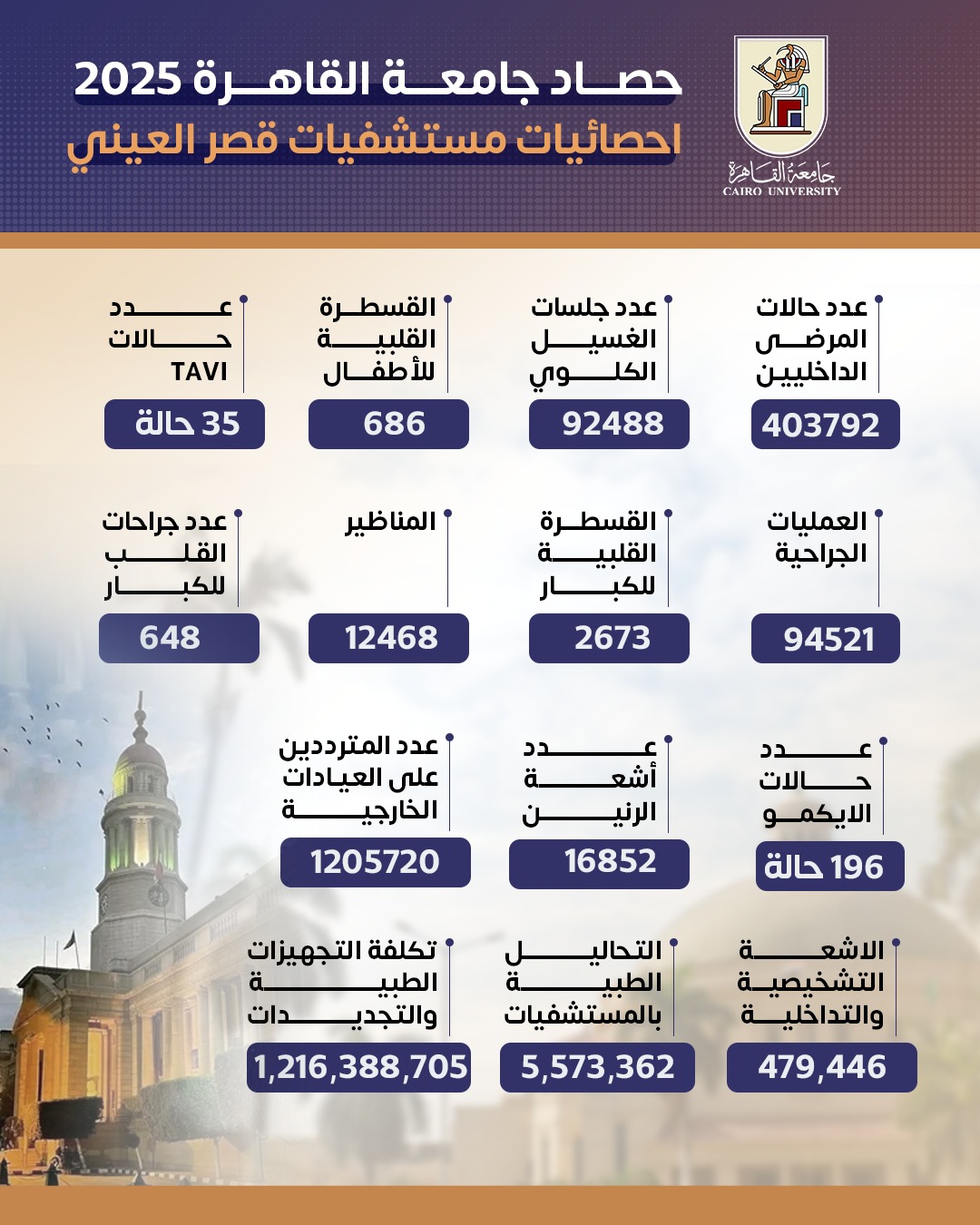 كشفت جامعة القاهرة، عن حصاد بعض إحصائيات مستشفيات قصر العيني 2025.