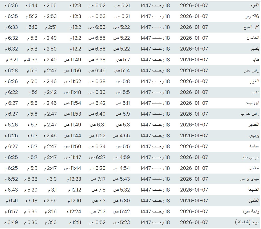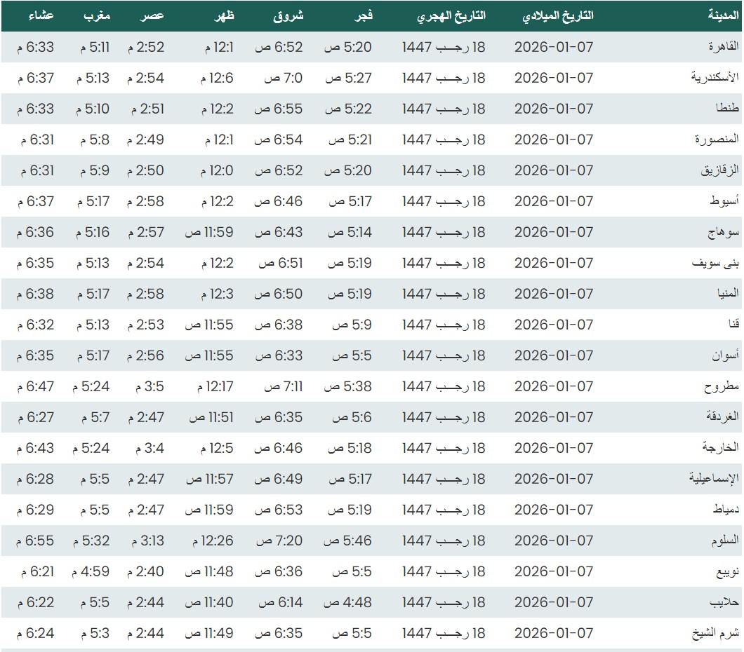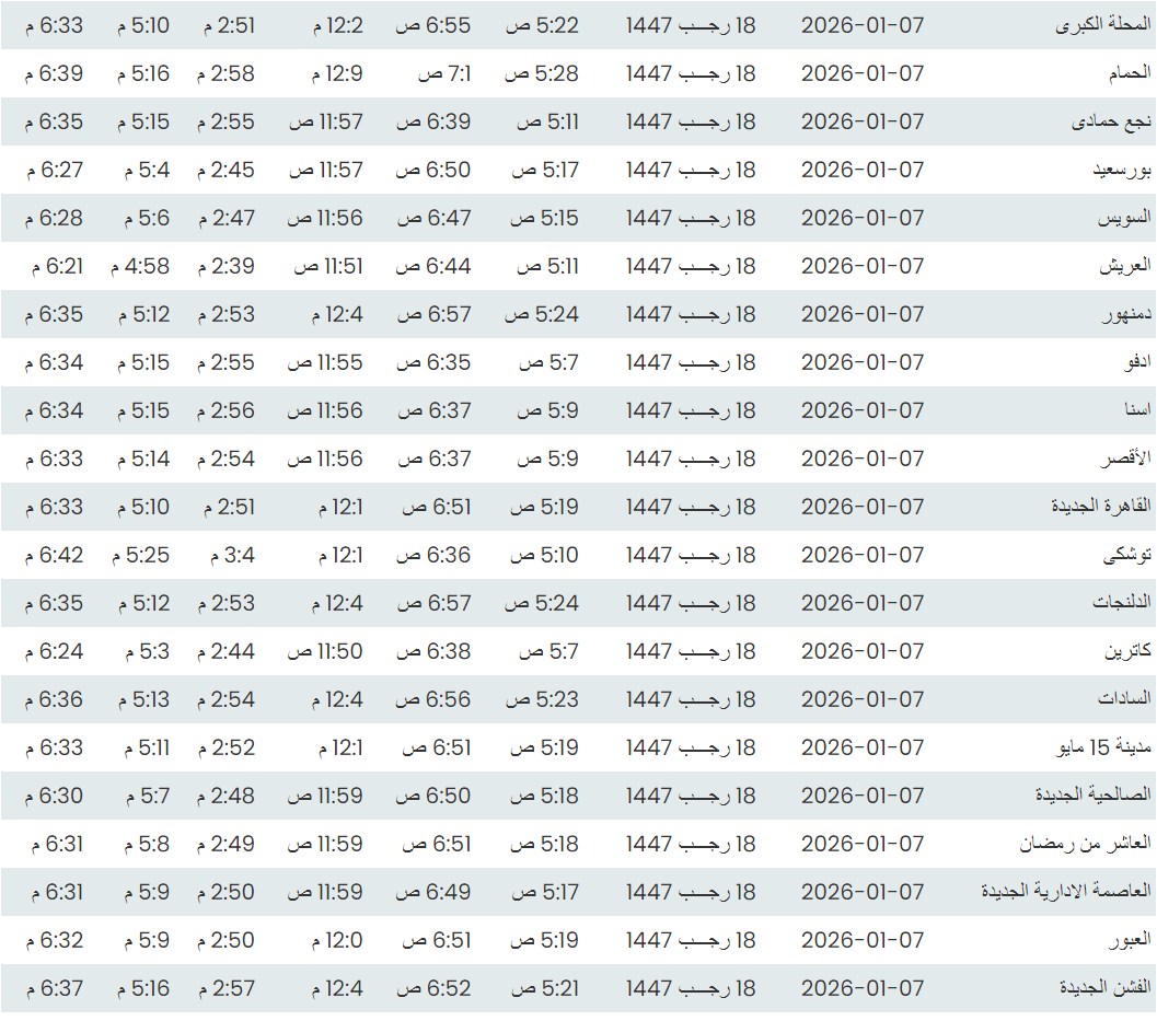 وفيما يلي مواقيت الصلاة، لعدد من مدن ومحافظات الجمهورية من واقع بيانات الهيئة العامة للمساحة