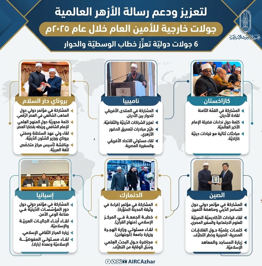 مع اتِّساع الحضور العالمي للأزهر الشريف، وترسيخ دَوره كمرجعيَّة دِينيَّة وإنسانيَّة تتجاوز الحدود والجغرافيا، وبدعمٍ وتوجيهٍ متواصلٍ من فضيلة الإمام الأكبر أ.د. أحمد الطيب، شيخ الأزهر الشريف، واصل أ.د. محمد الجندي، الأمين العام لمجمع البحوث الإسلامية، خلال عام 2025م، جولاتٍ خارجيَّةً واسعة حملت رسالة الأزهر إلى عواصم العالم، مؤكِّدة أنَّ الأزهر يمثِّل ضميرًا إنسانيًّا عالميًّا يتحرَّك حيث تُستدعَى الحكمة، ويُطلَب الاعتدال، وتشتدُّ الحاجة إلى خطابٍ دينيٍّ رشيد يجمع ولا يفرِّق، ويبني ولا يهدم.
