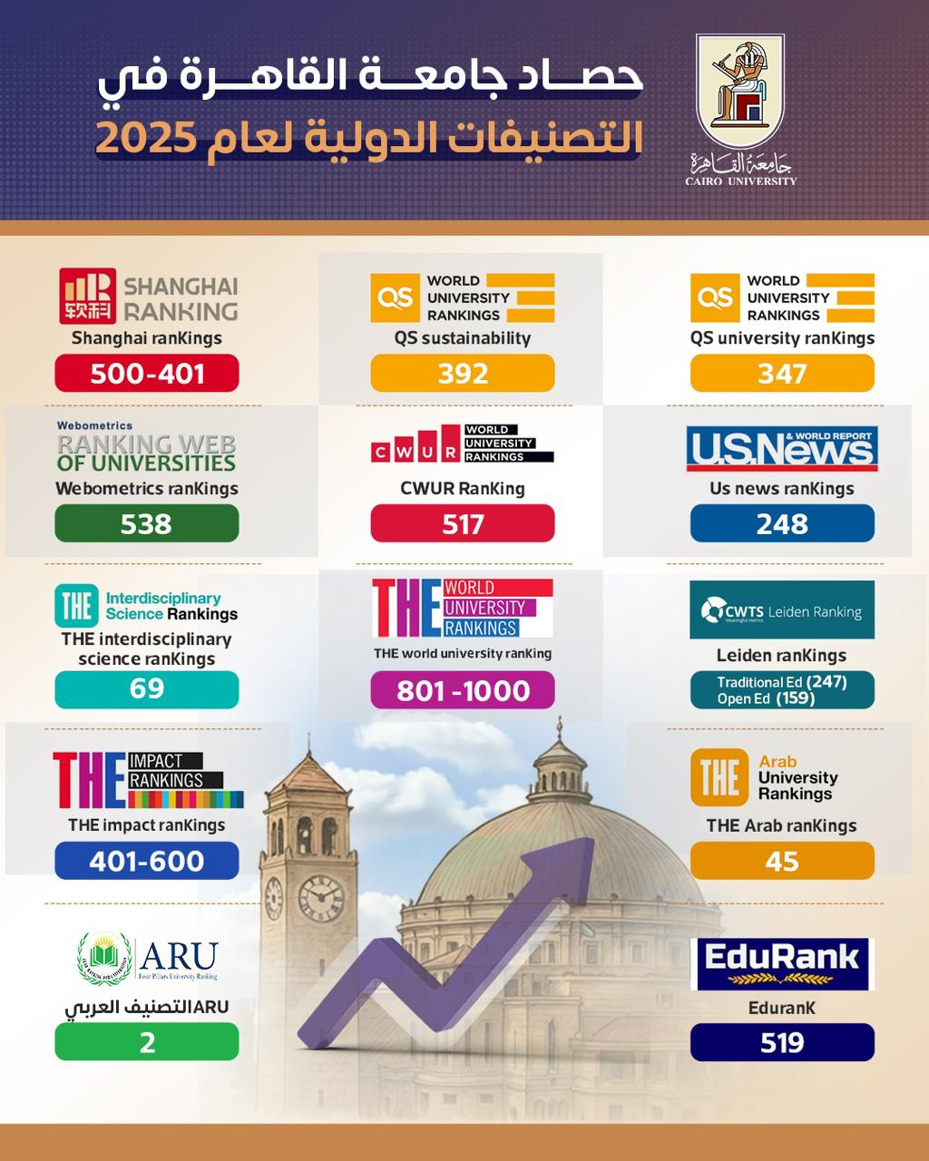 أعلنت جامعة القاهرة حصاد ترتيبها في التصنيفات الدولية خلال 2025، وأكدت الجامعة تعزيز مكانتها الأكاديمية عالميًا وإقليميًا، محققة حضورًا مميزًا في كبرى التصنيفات الدولية للجامعات لعام 2025.