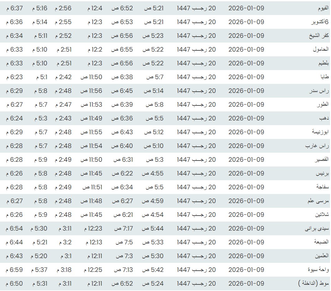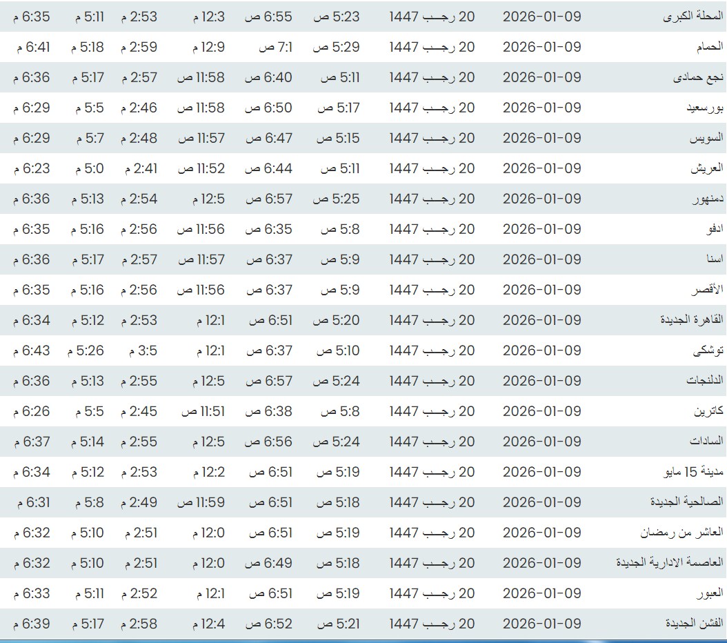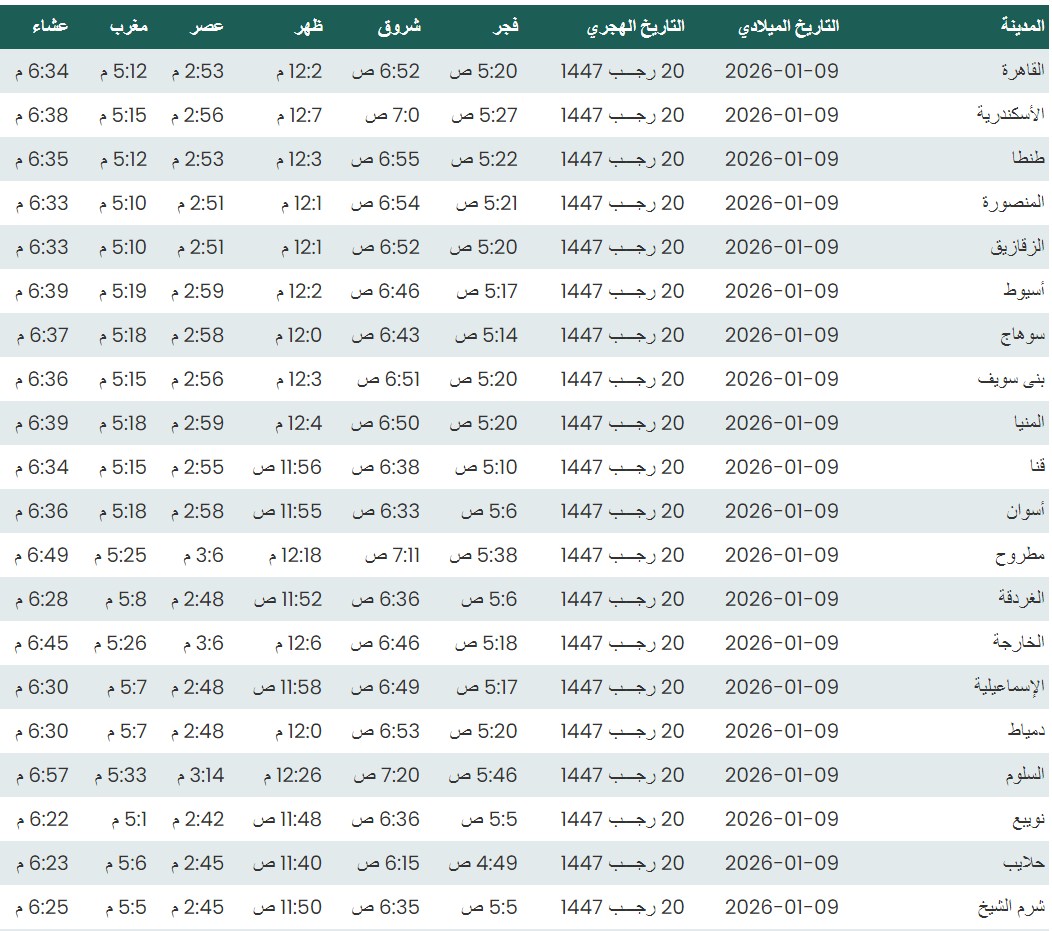 وفيما يلي مواقيت الصلاة، لعدد من مدن ومحافظات الجمهورية من واقع بيانات الهيئة العامة للمساحة
