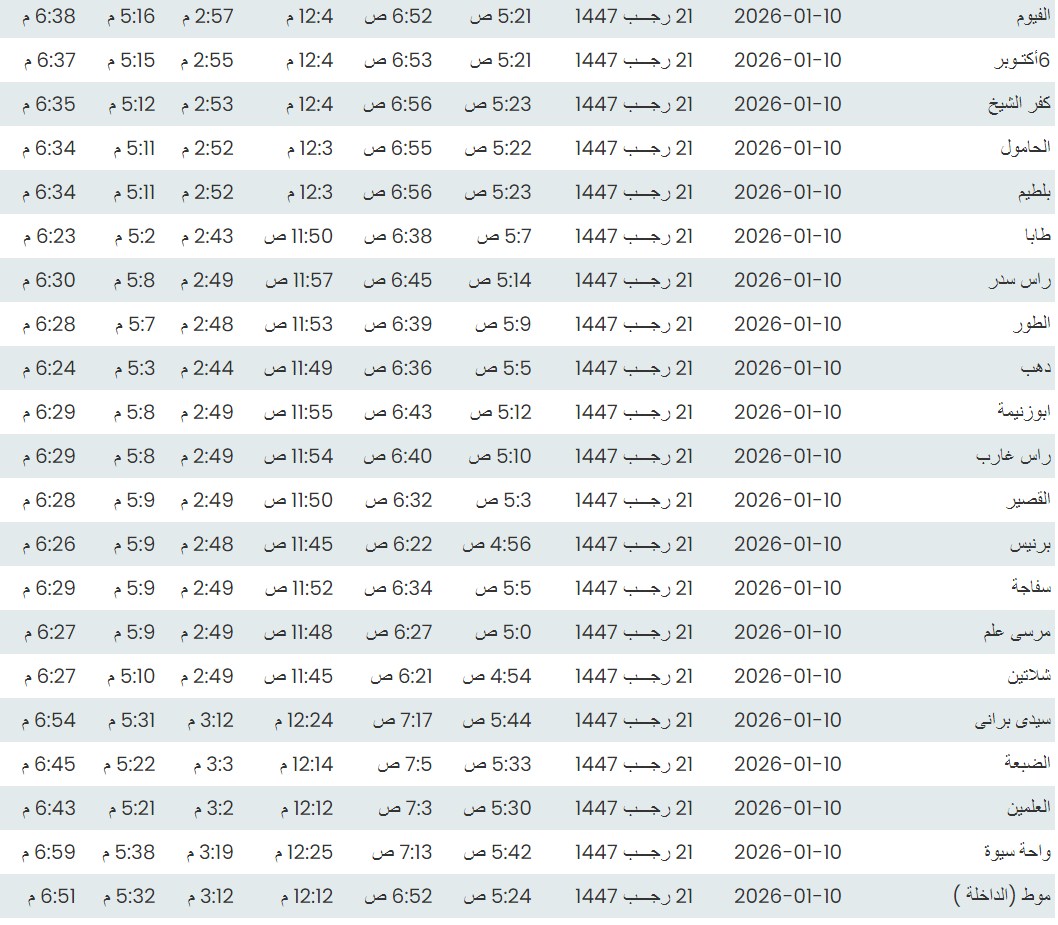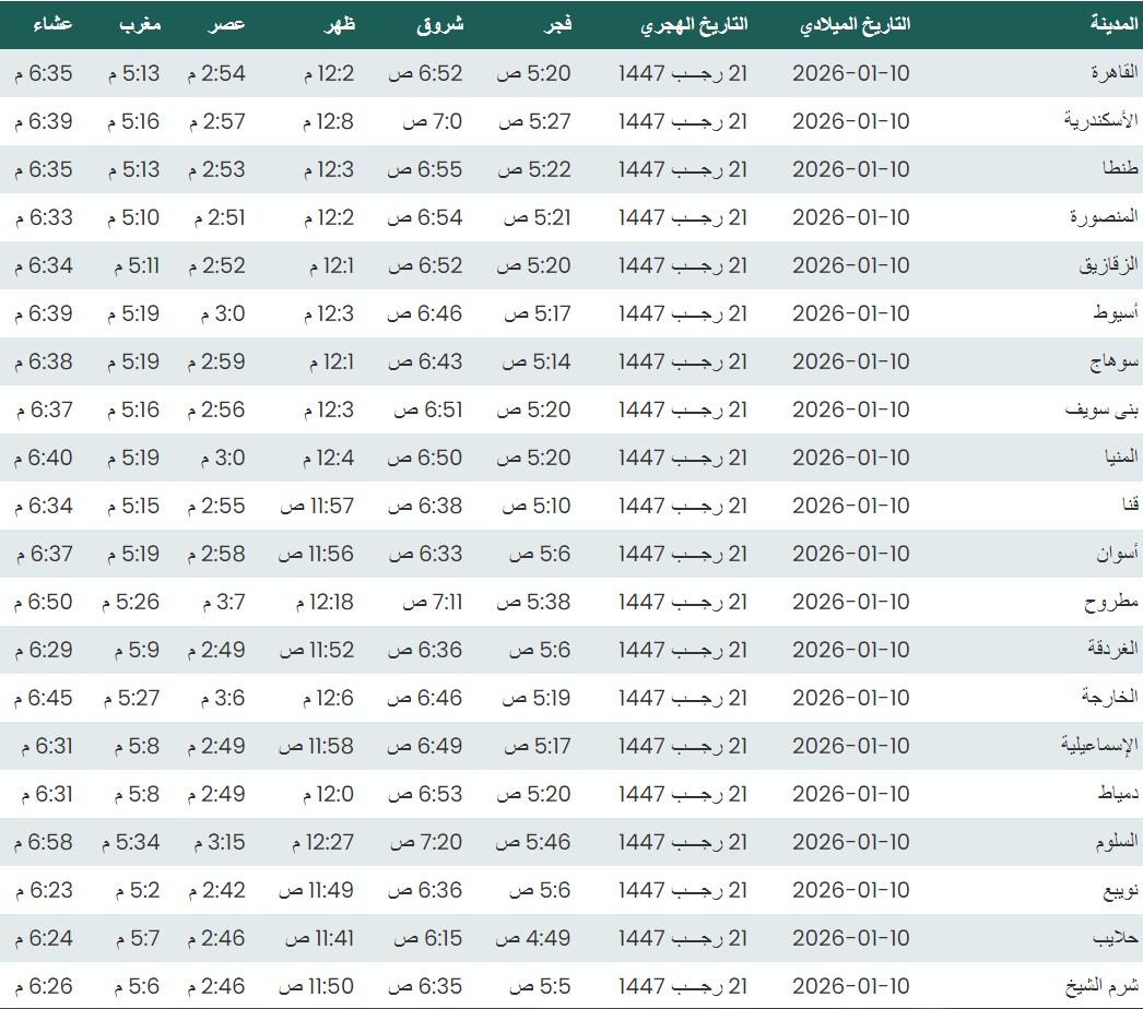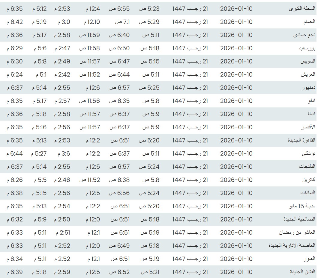وفيما يلي مواقيت الصلاة، لعدد من مدن ومحافظات الجمهورية من واقع بيانات الهيئة العامة للمساحة