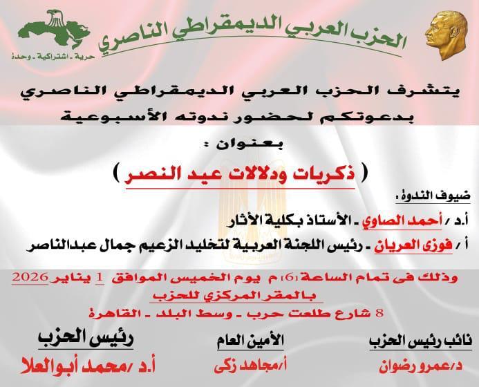 يعقد الحزب العربي الناصري برئاسة الدكتور محمد أبو العلا رئيس الحزب وعضو مجلس الشيوخ، ندوته الأسبوعية بمناسبة عيد النصر تحت عنوان ذكريات ودلالات عيد النصر، وذلك مساء غد الخميس الموافق 1 يناير 2026 بمقر الحزب المركزي بشارع طلعت حرب بالقاهرة.