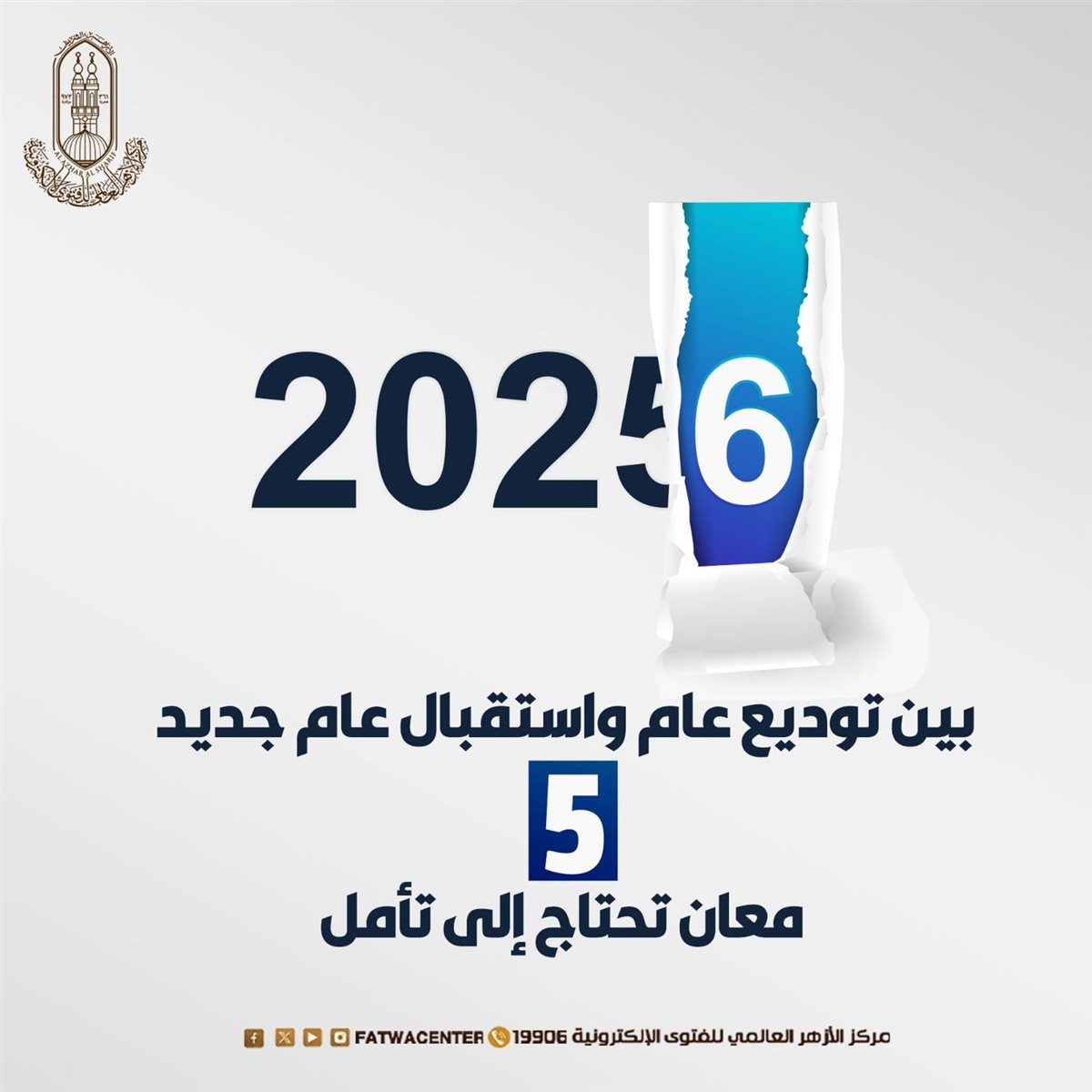 حرص مركز الأزهر العالمي للفتوى الإلكترونية على التأكيد على 5 معان هامة، وذلك مع توديع عام 2025 م، واستقبال العام الجديد، وذلك على النحو التالي: