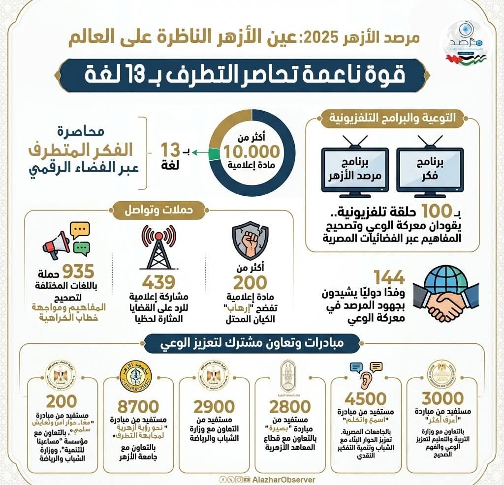 اختتم مرصد الأزهر لمكافحة التطرف عام 2025 بسجلٍ حافل من الإنجازات، أكد من خلاله حضوره كأحد أبرز الفاعلين الدوليين في تفكيك الخطاب المتطرف ومواجهة الفكر المتشدد، مستندًا إلى رؤية تقوم على صناعة الوعي بوصفها خط الدفاع الأول ضد التطرف. وانطلاقًا من هذه الرؤية، عمل المرصد على الربط المنهجي بين الرصد التحليلي العميق والتوعية المجتمعية المباشرة، محولًا رسالة الأزهر الشريف الوسطية إلى خطاب عالمي يخاطب الشعوب والثقافات بـ13 لغة مختلفة.