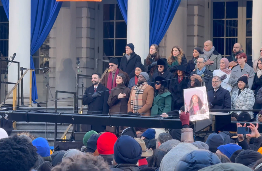 ووضع ممداني يده على المصحف الشريف وأدى اليمين، بينما رفرفت أعلام فلسطين إلى جانب لافتات كتب عليها: "فلسطين حرة"، وسط هتافات مؤيدة من شخصيات بارزة مثل الممثلة سوزان ساراندون، والمرشحة الرئاسية السابقة سينثيا نيكسون، والناشط الفلسطيني محمود خليل أحد قادة احتجاجات جامعة كولومبيا المناهضة للاحتلال الإسرائيلي.