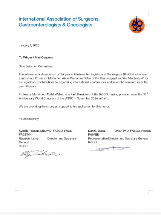 وأوضحت الرابطة، في خطاب رسمي صادر عنها، أن الدكتور محمد عبد الوهاب يُعد أحد أبرز القيادات الطبية المؤثرة في مجال الجراحة وأمراض الجهاز الهضمي والأورام على المستويين الإقليمي والدولي، حيث شغل منصب الرئيس السابق للرابطة الدولية (IASGO)، وأسهم خلال فترة رئاسته في تعزيز التعاون العلمي الدولي، وتوسيع نطاق المؤتمرات والبرامج التدريبية المتخصصة، ودعم تبادل الخبرات بين الأطباء والباحثين من مختلف دول العالم.