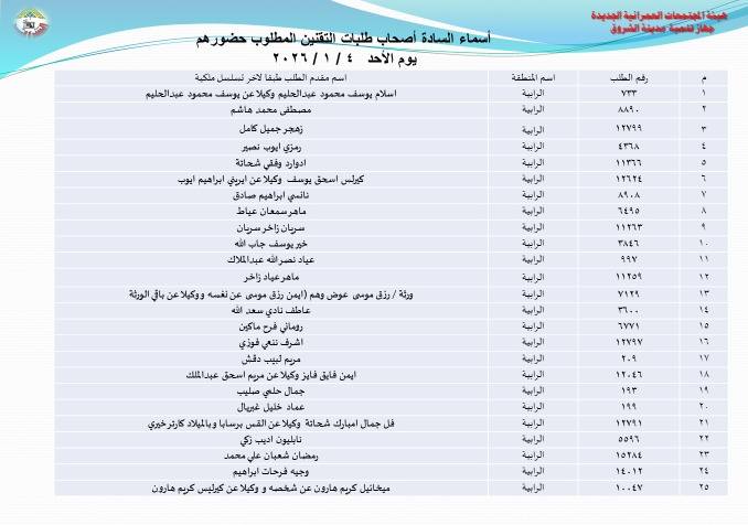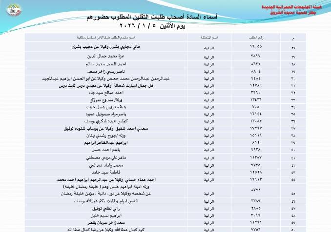 أعلنت هيئة المجتمعات العمرانية بوزارة الإسكان، عن أسماء دفعة جديدة من أصحاب طلبات تقنين أراضيهم بتوسعات مدينة الشروق، وطالبتهم بالحضور إلى مقر جهاز المدينة لاستكمال إجراءات التقنين، وذلك بداية من يوم الأحد المقبل 4 يناير الجاري.