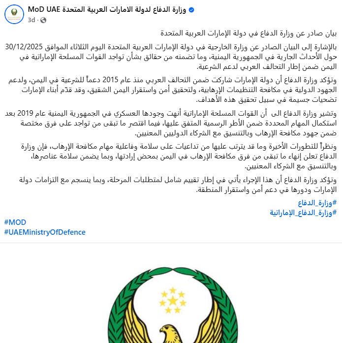 وقالت وزارة الدفاع في دولة الإمارات العربية المتحدة في بيان الثلاثاء: بالإشارة إلى البيان الصادر عن وزارة الخارجية في دولة الإمارات العربية المتحدة 30/12/2025 حول الأحداث الجارية في الجمهورية اليمنية، وما تضمنه من حقائق بشأن تواجد القوات المسلحة الإماراتية في اليمن ضمن إطار التحالف العربي لدعم الشرعية.