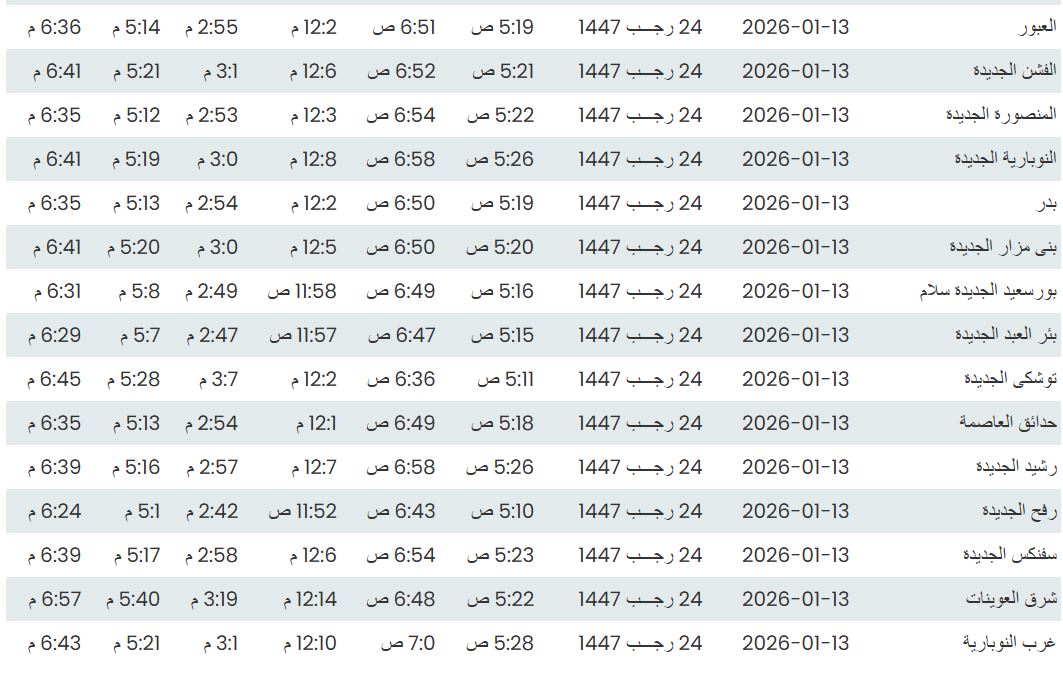 وفيما يلي مواقيت الصلاة، لعدد من مدن ومحافظات الجمهورية من واقع بيانات الهيئة العامة للمساحة