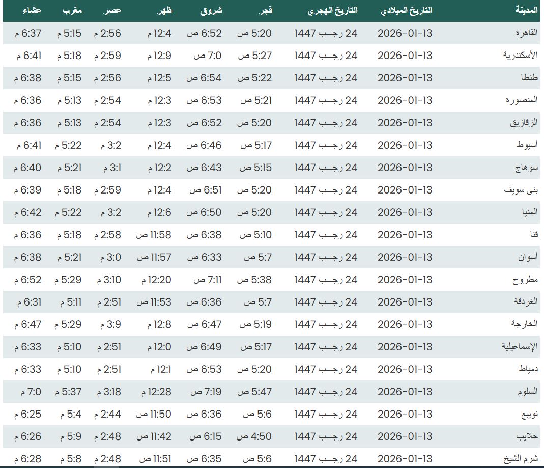 وفيما يلي مواقيت الصلاة، لعدد من مدن ومحافظات الجمهورية من واقع بيانات الهيئة العامة للمساحة