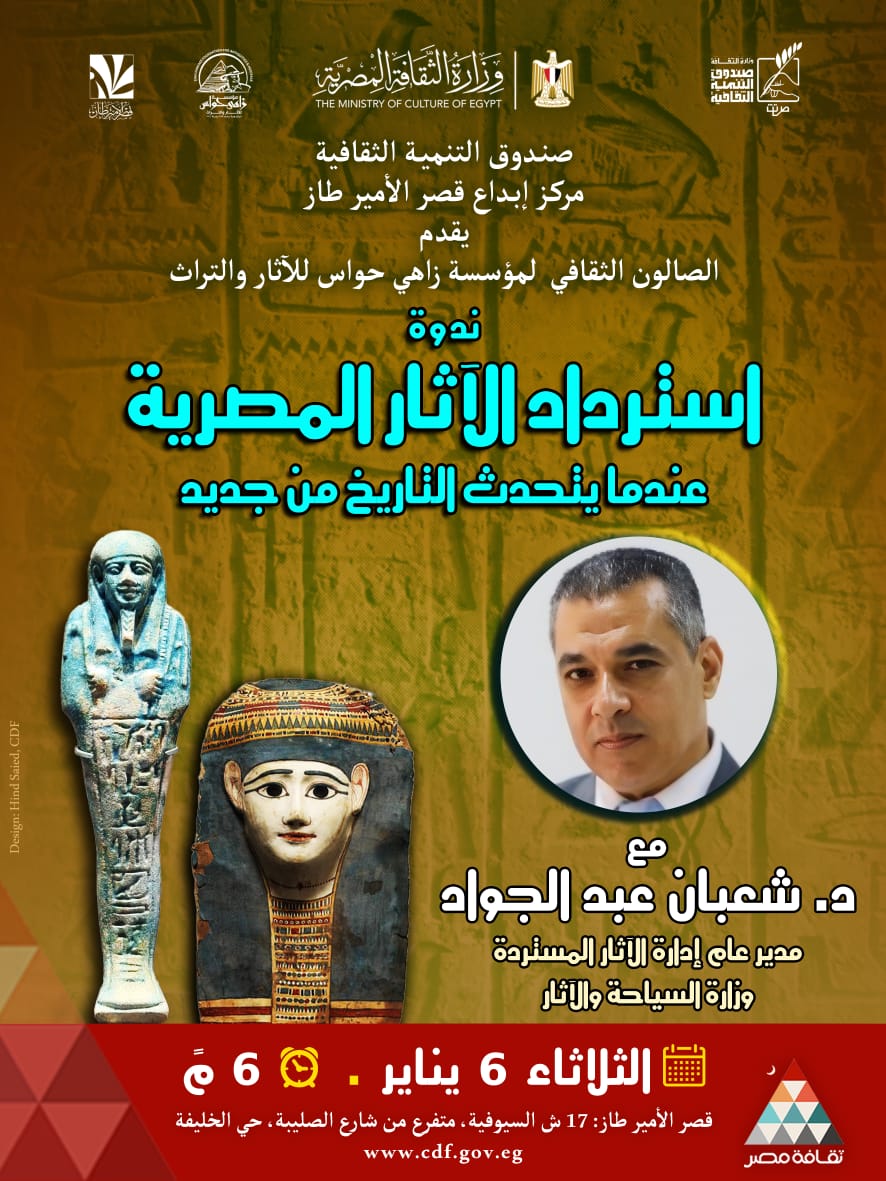 ينظم مركز إبداع قصر الأمير طاز بالسيوفية، بالتعاون مع الصالون الثقافي لمؤسسة زاهي حواس للآثار والتراث، ندوة ثقافية بعنوان «استرداد الآثار المصرية… عندما يتحدث التاريخ من جديد»، وذلك في السادسة مساء الثلاثاء 6 يناير.