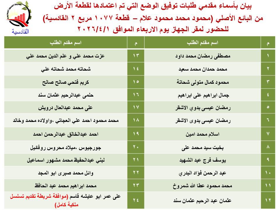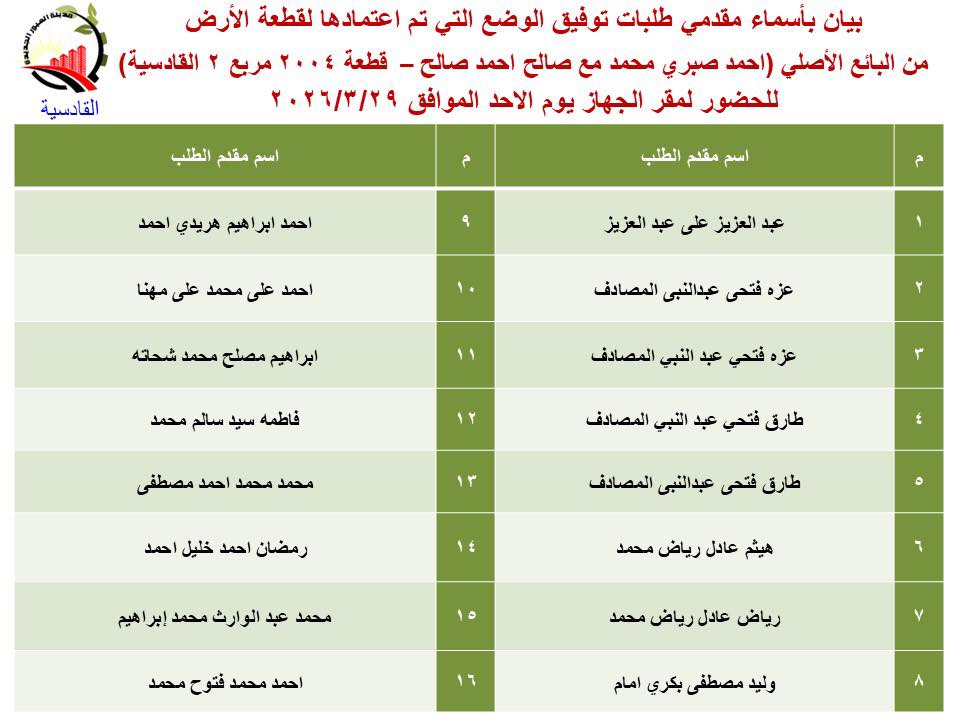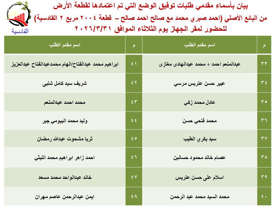 كشفت وزارة الإسكان والمرافق والمجتمعات العمرانية عن تقنين دفعة جديدة من أراضي المواطنين بمنطقة القادسية بمدينة العبور الجديدة، الذين تم اعتماد توفيق أوضاع أراضيهم لاستكمال إجراءات التقنين.