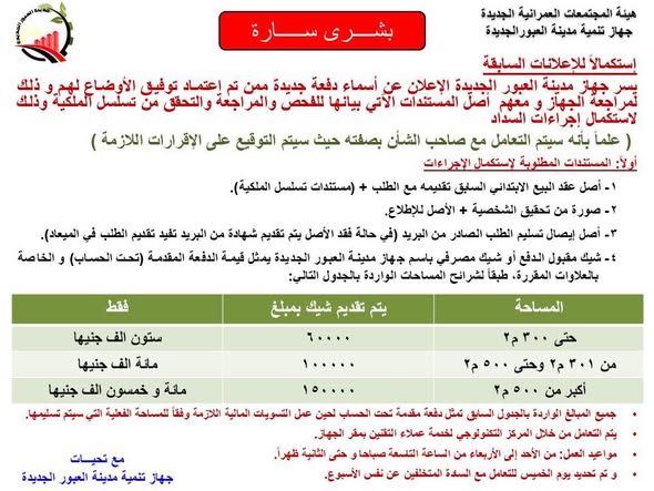 وناشد جهاز مدينة العبور الجديدة المواطنين بمراجعة الجهاز لاستكمال الإجراءات والسداد، علمًا بأنه سيتم التعامل مع صاحب الشأن بصفته، حيث سيتم التوقيع على الإقرارات اللازمة، وذلك بداية الأحد 29 مارس المقبل.