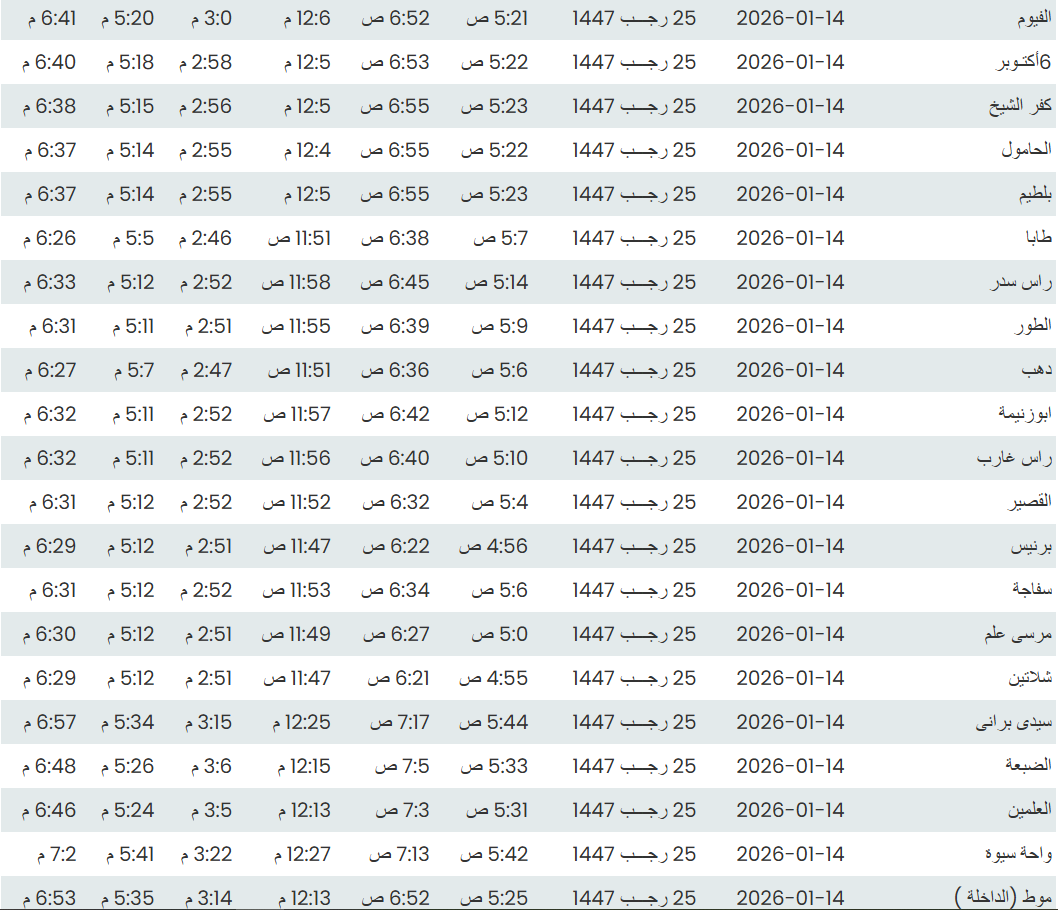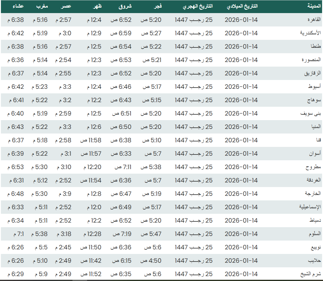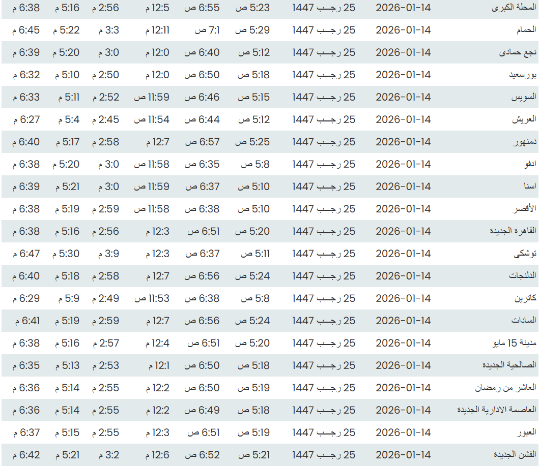 وفيما يلي مواقيت الصلاة، لعدد من مدن ومحافظات الجمهورية من واقع بيانات الهيئة العامة للمساحة