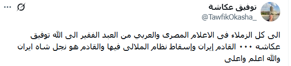 وقال توفيق عكاشة عن الدولة القادمة التي سيحدث بها تغيير للنظام بعد فنزويلا، في رسالة وجهها لكل الإعلام العربي: "إلى كل الزملاء فى الإعلام المصرى والعربي من العبد الفقير إلى الله توفيق عكاشة... القادم إيران وإسقاط نظام الملالى فيها والقادم هو نجل شاه إيران والله أعلم وأعلى".