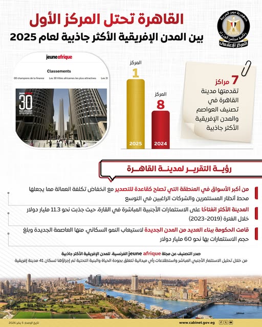 نشر المركز الإعلامي لـ مجلس الوزراء إنفوجرافًا عبر منصاته على مواقع التواصل الاجتماعي، سلط من خلاله الضوء على تصدر مدينة القاهرة قائمة المدن الإفريقية الأكثر جاذبية لعام 2025، وذلك وفقًا لتقرير مجلة "Jeune Afrique" الفرنسية.