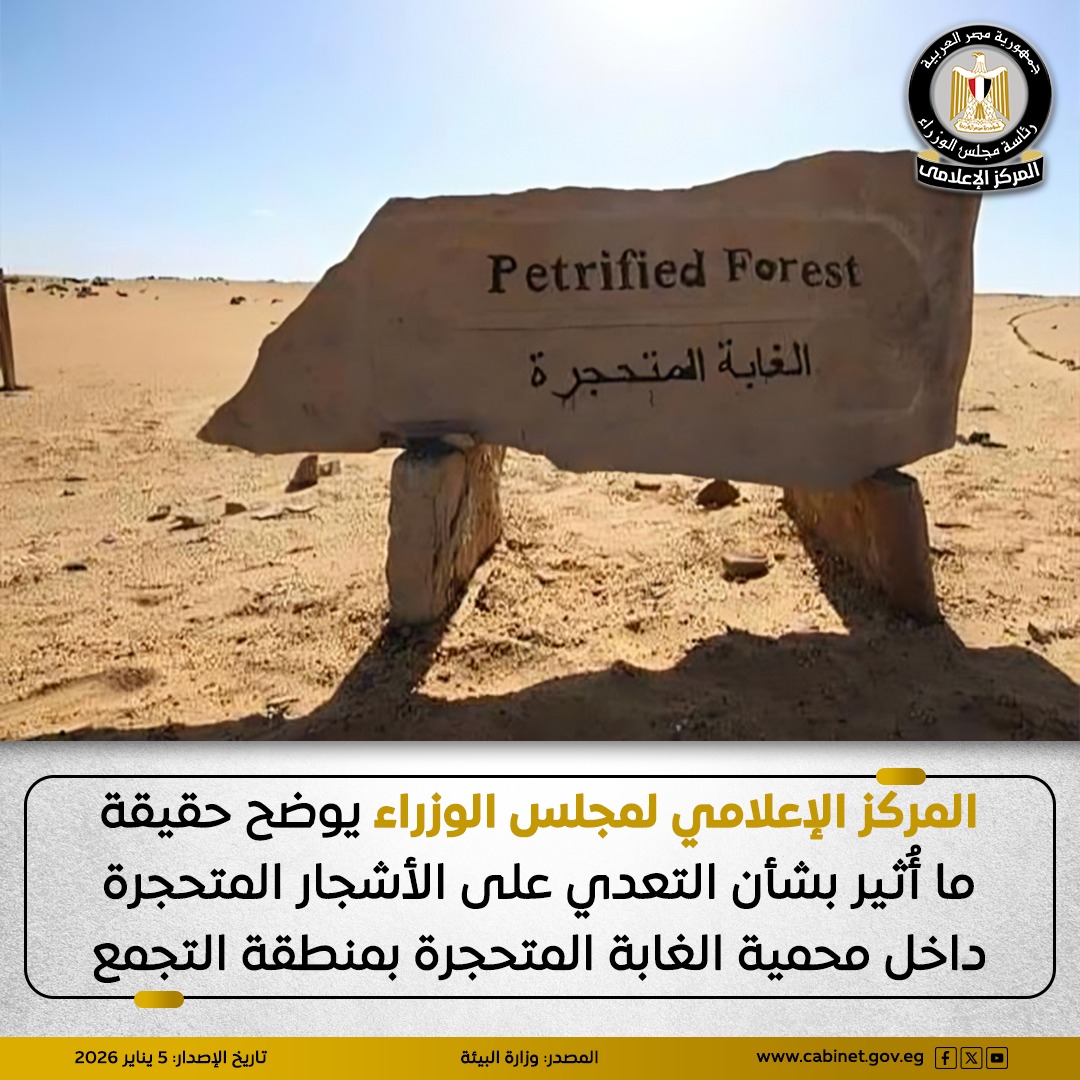 نشر المركز الإعلامي لمجلس الوزراء بيانًا عبر منصاته الرسمية على مواقع التواصل الاجتماعي، أوضح من خلاله حقيقة ما تم تداوله بشأن التعدي على الأشجار المتحجرة داخل محمية الغابة المتحجرة بمنطقة التجمع.